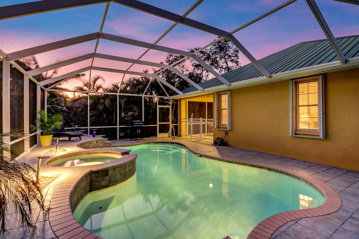 Unwind in this modern escape, perfect for up to 6 guests. The home features a hot tub, king-size bed, a convertible twin beds to a King size if desired, queen-size pull-out sofa. Enjoying BBQ on the screened large patio. With a 1-car garage and a LARGE driveway, plenty of room boat or RV. Located just 0.5 miles to Hyatt Regency Resort, 8 miles to beaches, 1 mile to Coconut Point Mall, 6 miles to Gulf Coast Center, 10 miles to Mercato, and 8 miles to RSW Airport.