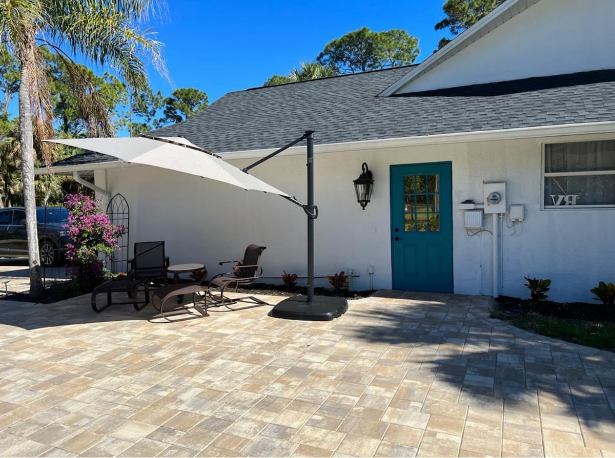 Your private modern studio oasis awaits! Separate entrance, designated parking, queen bed, and loveseat pull-out make it ideal for couples, solo travelers, or small families. Relax on the patio or cook light meals in the kitchenette with induction cooktop, air fryer, fridge, and coffee bar. Minutes from Ave Maria, Naples beaches, trails, dining, Great Wolf Lodge, and local shops—comfort and convenience in Golden Gate Estates!