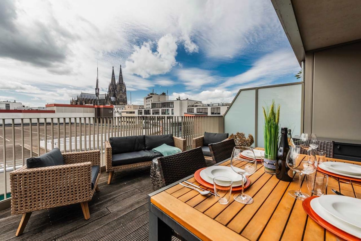 Luxury pure: A super cool Penthouse atop a city hotel, with a panoramic view over Cologne and of its famous cathedral, even from the bathtub. 1500 square feet, very stylish equipped with antique furniture and modern art; perfectly connected to public transport.
