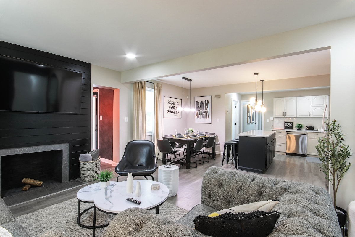 Deze gerenoveerde, moderne eenverdiepingswoning in ranchstijl biedt bijna 213 vierkante meter ruimte en een grote achtertuin. Met 4 ruime slaapkamers met smart-tv's, 3 complete badkamers, een bioscoopkamer met een 4K-projector en een 120-inch scherm, een gezellige leeshoek, dubbele dekken, een patio met vuurplaats en voldoende eetruimte, biedt deze residentie comfort en entertainment. Het ligt op slechts enkele minuten van het centrum en biedt gemakkelijke toegang tot eetgelegenheden en lokale bezienswaardigheden. STR-000109-2025