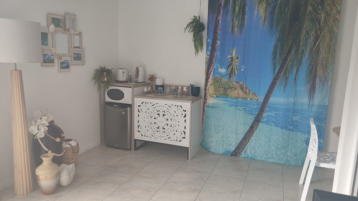 Deze studio met airconditioning ligt tussen de baaien Cook en Opunohu, op 20 minuten van de veerboot en op 5 minuten van een supermarkt. Het heeft een eigen ingang, badkamer, kitchenette en 200 Mbps glasvezel-wifi. Rustige woonwijk, met toegang tot de lagune op 100 m afstand en een prachtig openbaar strand op 2 km afstand — perfect voor prachtige zonsondergangen.