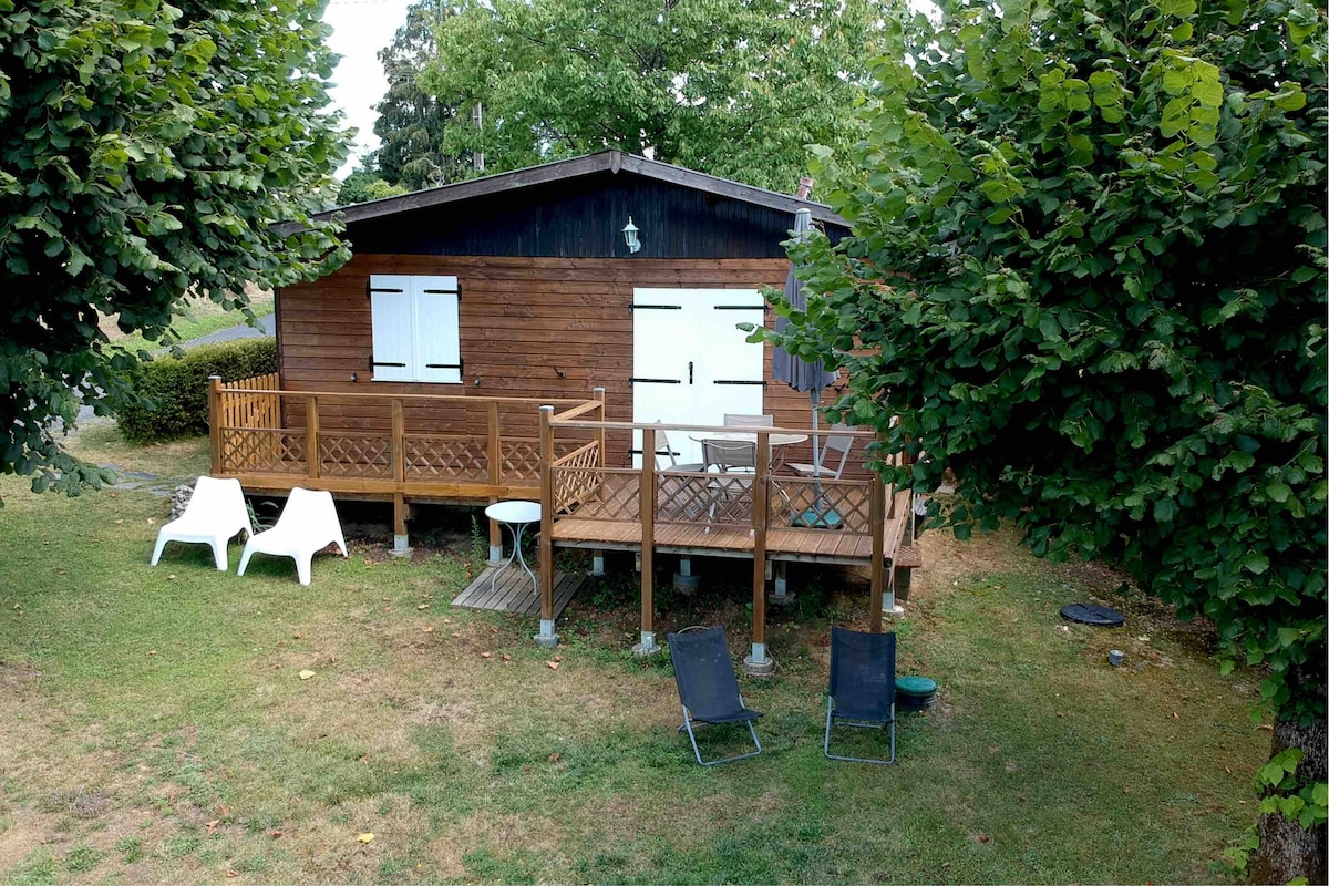 Chalet 50 m2 à Malemort/Corrèze - vue sur Brive - campagne Pièce principale et coin salon, écran plat, canapé lit cuir 140x190, possibilité de séparation avec la cuisine, plaque induction, lave vaisselle, micro ondes, four, frigo congel., tassimo (café, thé, chocolat) Chambre lit 160 x 200 WC séparé Salle d'eau : douche, sèche serviette, lave linge Terrasse coin repas 4 pers max Non fumeur Petits animaux acceptés après accord Linge de lit, toilette, et cuisine Chauffage électrique en sus hiver