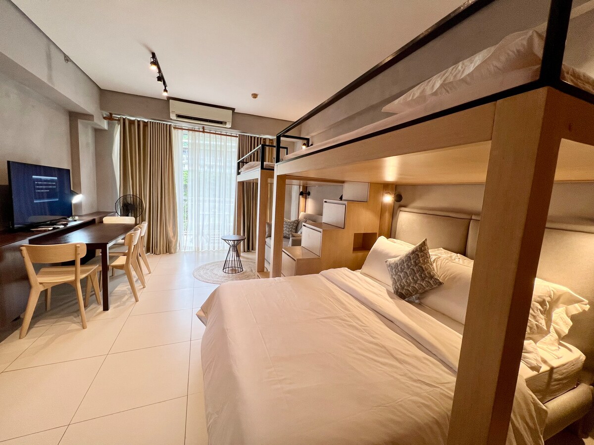 Welkom bij Yugen Suites, je rustige toevluchtsoord aan zee, waar minimalistisch Japans design de natuurlijke schoonheid van Mt. Pico De Loro. Dit onlangs gerenoveerde appartement ligt op de tweede verdieping van het Carola B-gebouw in de prachtige kust van Hamilo en is een studio-slaapkamer van 47 m ² met eigen keuken en badkamer ontworpen met een schone, natuurlijke esthetiek. — CAPACITEIT — Pico-regels beperken de capaciteit van de kamer tot 6 personen, waaronder kinderen van 1 jaar en ouder. Geen uitzonderingen.