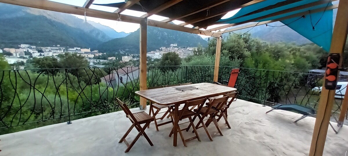 40m2 gemeubileerd appartement van alle gemakken voorzien (wasmachine , barbecue, ligbedden, tv...) Maximaal twee personen. Beddengoed en handdoeken worden voorzien. Eigen terras 35 m2 panoramisch uitzicht bergdorp Venaco 600 M hoogte. (Restaurant, treinstation, postkantoor...) Op 1 uur van Bastia, Ajaccio, Île Rousse Rivieren op 5 minuten afstand, tennis en gemeentelijk zwembad op 200 meter afstand. Corte op 12 km afstand (museum, supermarkt...) Strand op 25 minuten. Natuuractiviteiten GR20 wandelpaden. Gratis Wifi & Parkeren