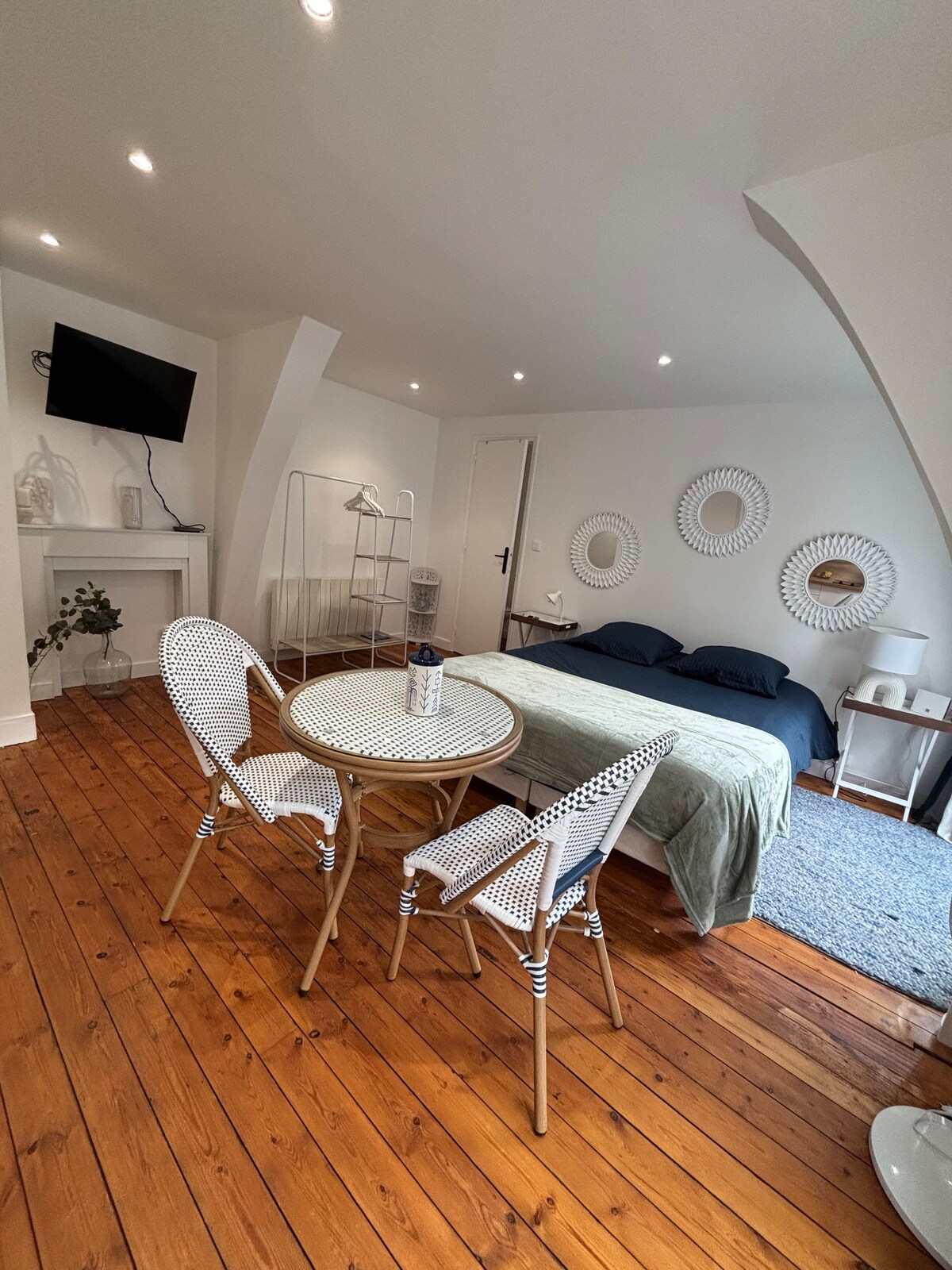 Klein huis in de vorm van een studio met terras aan de achterkant van onze tuin. Het is volledig ingericht en voorzien van een kitchenette met kookplaten, oven en magnetron. Het beddengoed is in 140 met een dressing, tv, wifi, cd-speler. De onafhankelijke badkamer is uitgerust met een douche, wastafel en toilet. Het terras is uitgerust met tuinmeubilair en een zonneterras Een reiswieg kan worden verstrekt. Rustige omgeving, 10 minuten lopen naar het stadscentrum van