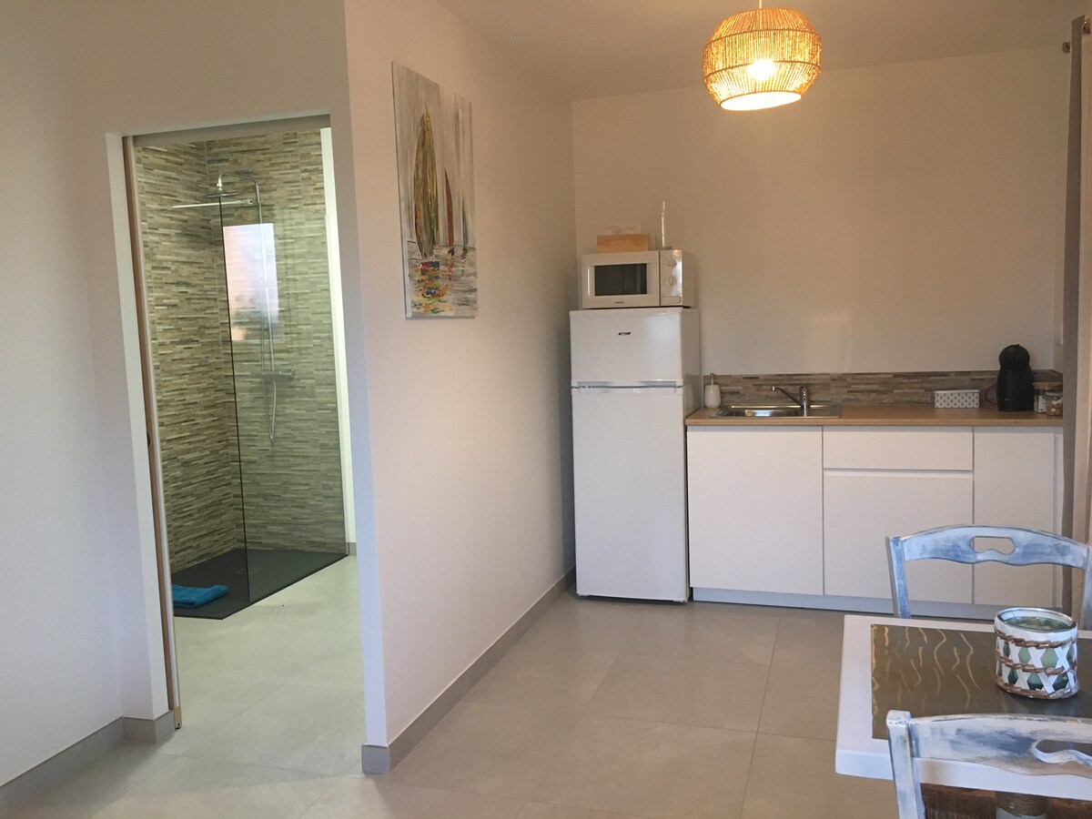Rustige buurt, dicht bij handel ( 1 km) en strand (3 km) Nieuwe cocooning afhankelijkheid (27m2) met eigen toegang. Samengesteld uit een slaapkamer (bed 160*190) tv, badkamer met toilet en eethoek (koelkast-vriezer, wastafel, multifunctionele oven, inductiekookplaat buiten, Dolce Gusto koffiezetapparaat enz...) tuinzwembad parkeerplaats, wifi.