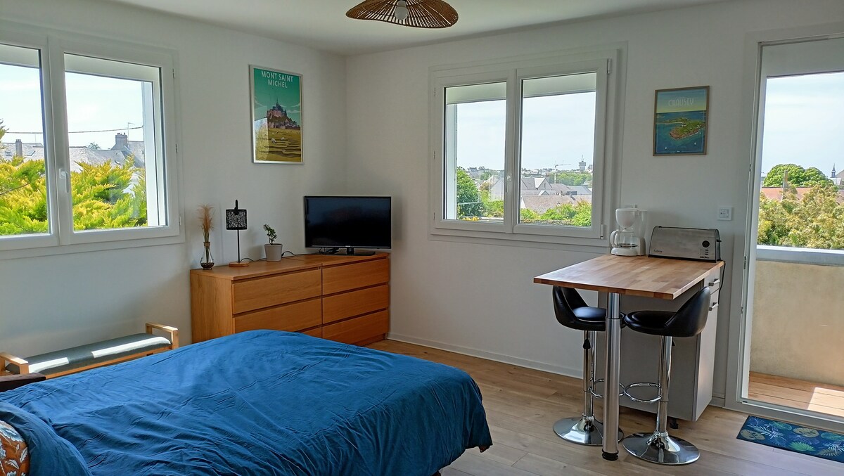 Nieuw in augustus 2021. Aangenaam appartement, comfortabel en licht, 3 kamers, met prachtig uitzicht op zee, jachthaven en stadscentrum, met uitzicht op het strand van Le Herel in Granville. Een mooie woonkamer met een ingerichte open keuken, balkon met uitzicht op zee. Het appartement is gelegen in een charmant, rustig condo, toegang tot de accommodatie via een kleine binnenplaats, eigen trap. Privé parkeren. Wij zorgen voor alle beddengoed, handdoeken en handdoeken