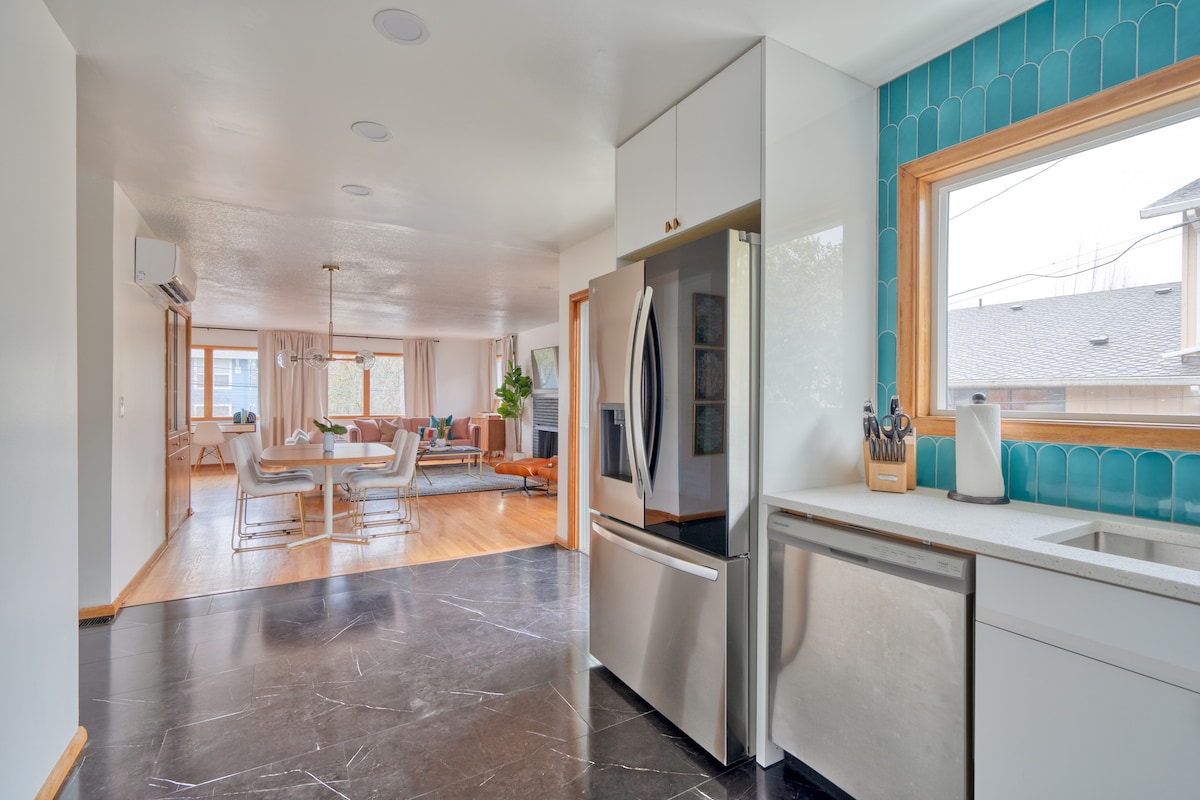 Welkom in onze chique moderne retraite met 2 slaapkamers en 1 badkamer in het midden van de eeuw, waar tijdloos design en eigentijds comfort samenkomen. Ons volledig gerenoveerde appartement biedt een stijlvolle en uitnodigende ruimte, perfect voor je uitje. Geniet van het gemak van de loopafstand van culinaire hoogstandjes, met City Thai, Gigi 's Cafe en het Hillsdale Food Cart Park op slechts een steenworp afstand. Dompel jezelf onder in de levendige lokale scene, of blijf thuis en gebruik de volledig uitgeruste keuken om een heerlijke maaltijd te bereiden.