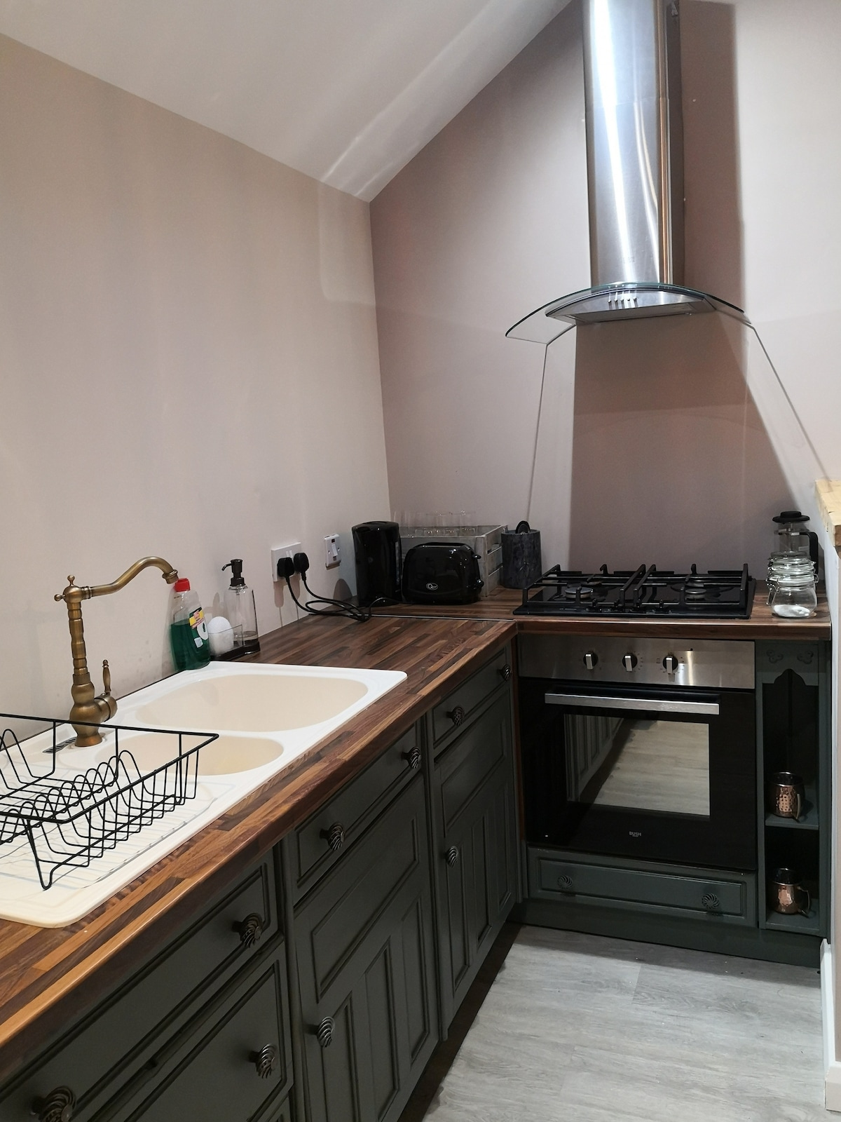 Lichte, luchtige, vrolijke en goed ingerichte loft appartement, een slaapkamer met een kingsize bed en een bank die kan worden omgezet in een eenpersoons- (3' 6" breed) of tweepersoonsbed (4'8") in de woonkamer. Er is een douche en-suite met w.h.b en toilet. Een volledig uitgeruste moderne keuken met koelkast, wasmachine, elektrische kookplaat, magnetron, waterkoker en broodrooster. 46 inch flatscreen Sky Q-televisie (alle kanalen) en gratis WiFi. We hebben drie aparte accommodaties (geschikt voor 9 tot 10 personen, geen kippen of herten.)