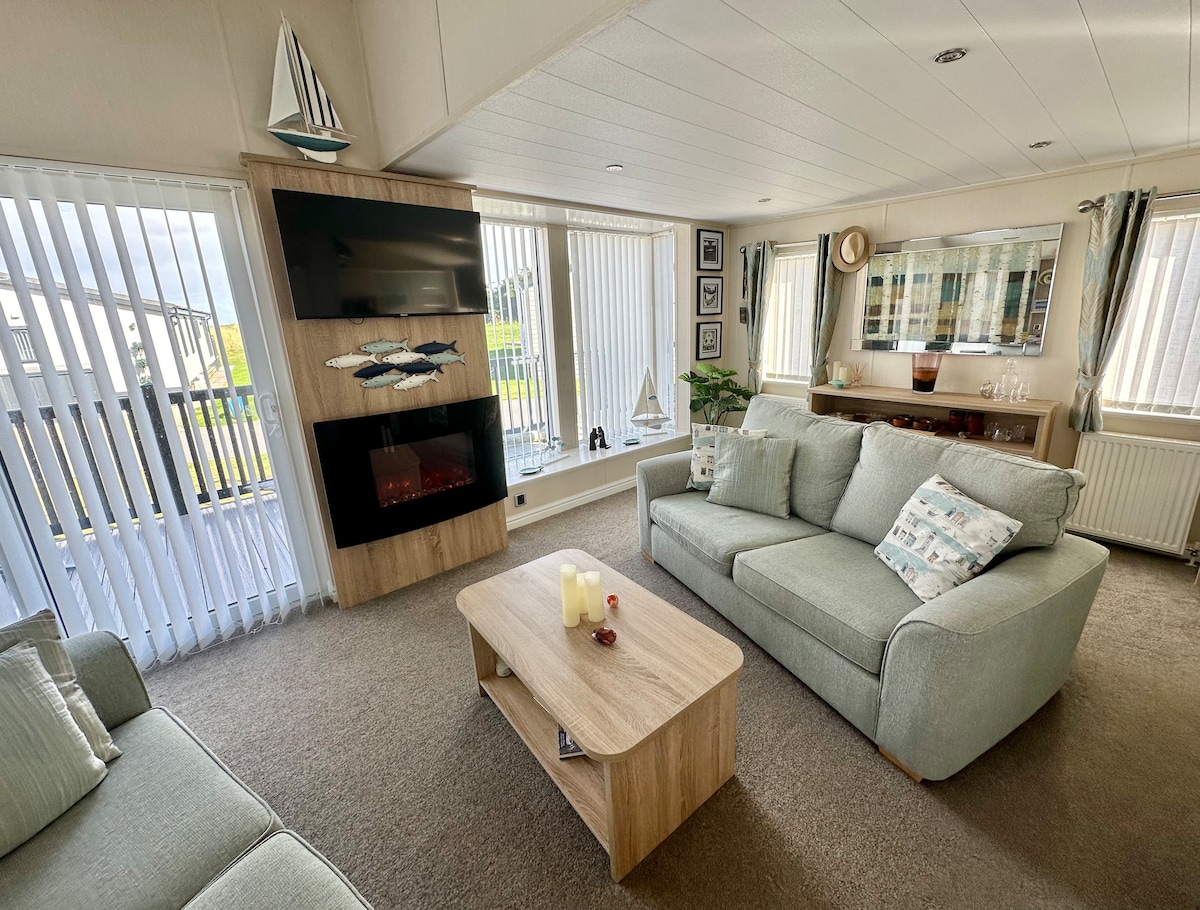 Luxe ruime caravan in 2017 met terras en WIFI,met een glorieus strand net over de duinen. 18 holes golfbaan voor de deur, kinderpark, zwembad, fitnessruimte, winkel, restaurant, arcades, bar en een uitstekende entertainmentfaciliteit die geschikt is voor iedereen. Let op: entertainmentpassen zijn niet inbegrepen en kunnen bij de receptie worden gekocht.