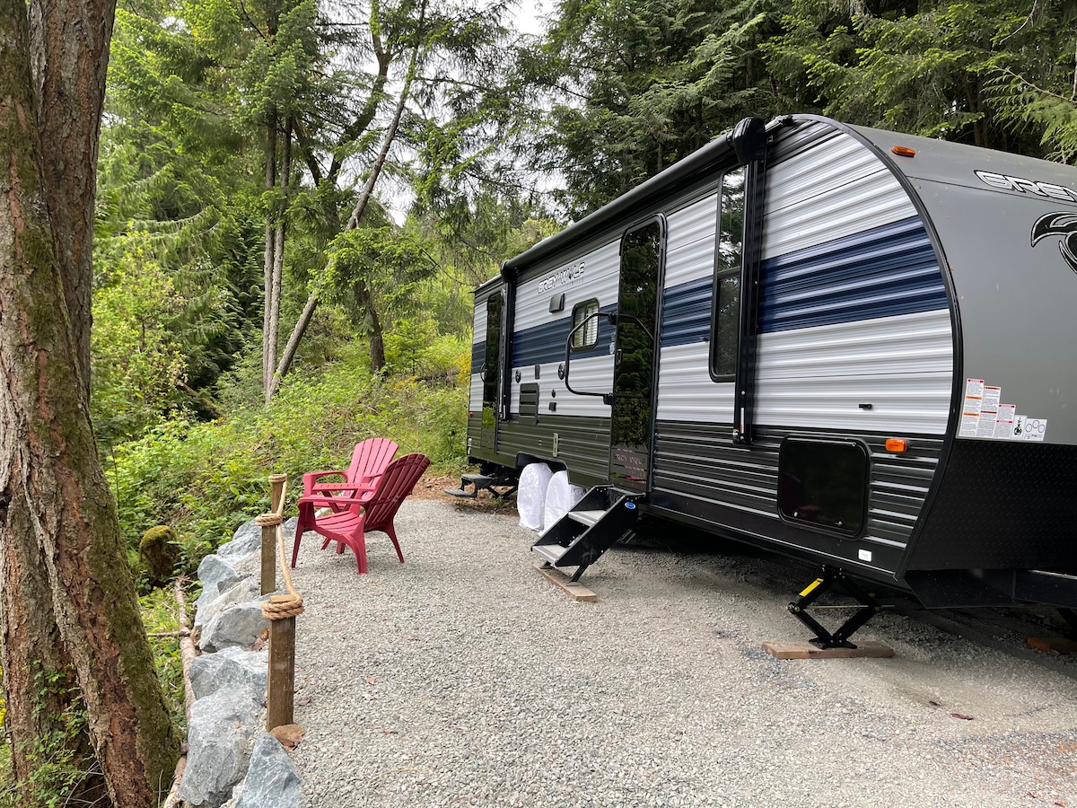 RV Glamping G-2: gezellige 35' trailer met stapelhuis