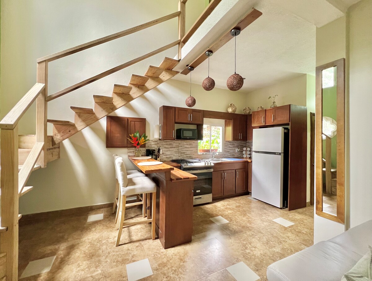 Deze gezellige casita (studio) heeft een warm tropisch gevoel. Het is in de buurt van het zwembad, maar niet te dichtbij. Het heeft een volledig uitgeruste kitchenette met alles wat je nodig hebt om maaltijden te bereiden en je drankjes koud te houden. De badkamer heeft een grote douche en veel ruimte voor je om je voor te bereiden op je nacht in West End. Drink 's ochtends koffie op je eigen terras en zie de wilde ara' s binnenvliegen voor hun ochtendbezoek. De weelderige jungle is overal om je heen met een briesje om je koel te houden terwijl je ontspant in de hangmat.