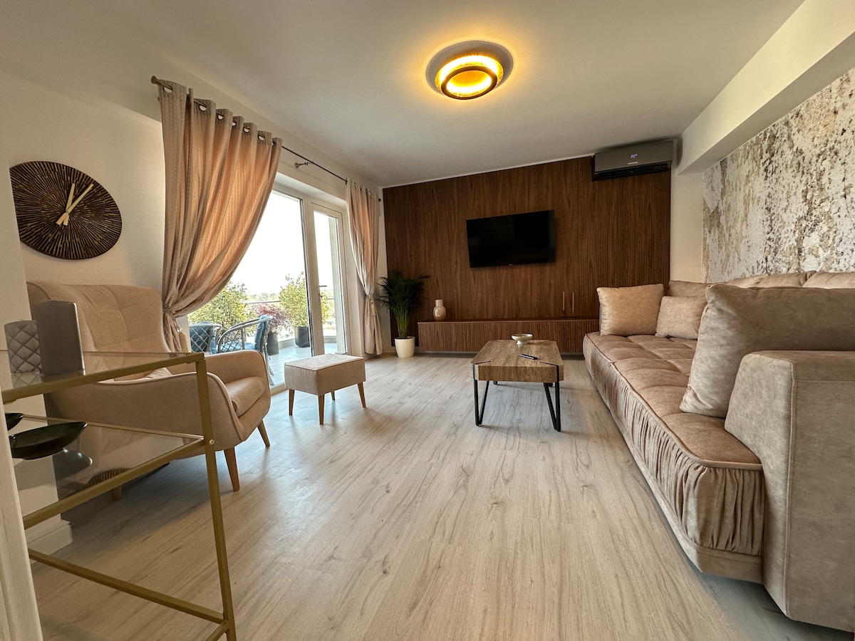 Het appartement is perfect gelegen in het stadscentrum en brengt je dicht bij de kerstmarkt van Craiova, de oude stad en het kunstmuseum. Het biedt een prachtig uitzicht op het centrale gebied en werd in 2025 gemoderniseerd: nieuw bed en kledingkast, comfortabele bank, nieuwe airconditioning, wasmachine en premium voorzieningen voor luxe comfort. Je kunt ontspannen in de woonkamer of uitrusten in een gezellige slaapkamer met alles wat je nodig hebt om je thuis te voelen.