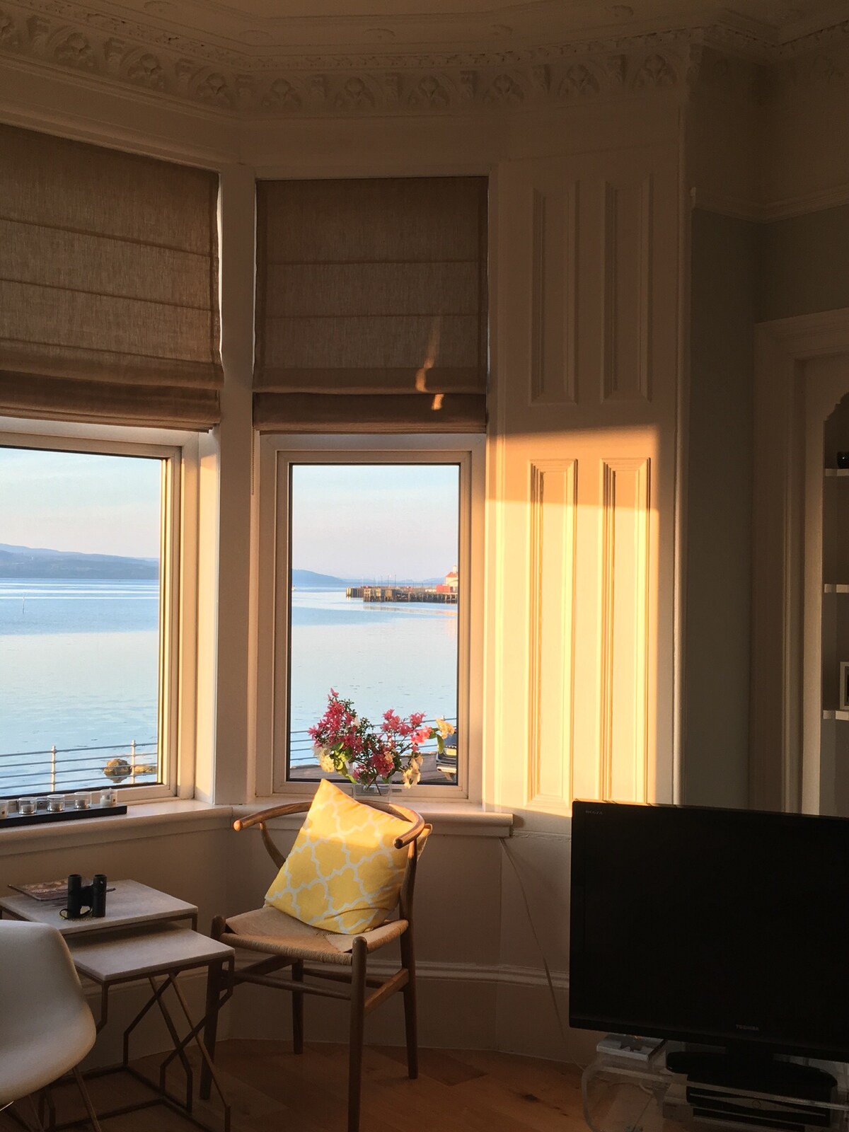 Prachtig uitzicht vanuit de lichte woonkamer. Jachten, veerboten, vissersboten en af en toe een bruinvis houden je vermaakt terwijl je bij het raam zit met een kopje koffie. Dit Victoriaanse appartement heeft veel originele kenmerken en de inrichting is klassiek met af en toe een eigenzinnige bloei. De slaapkamer is aan de achterzijde en is rustig en comfortabel; de badkamer heeft een douche met een zeer lage opstap bij binnenkomst. Er is een eigen patio in de gemeenschappelijke tuin aan de achterkant van het pand.