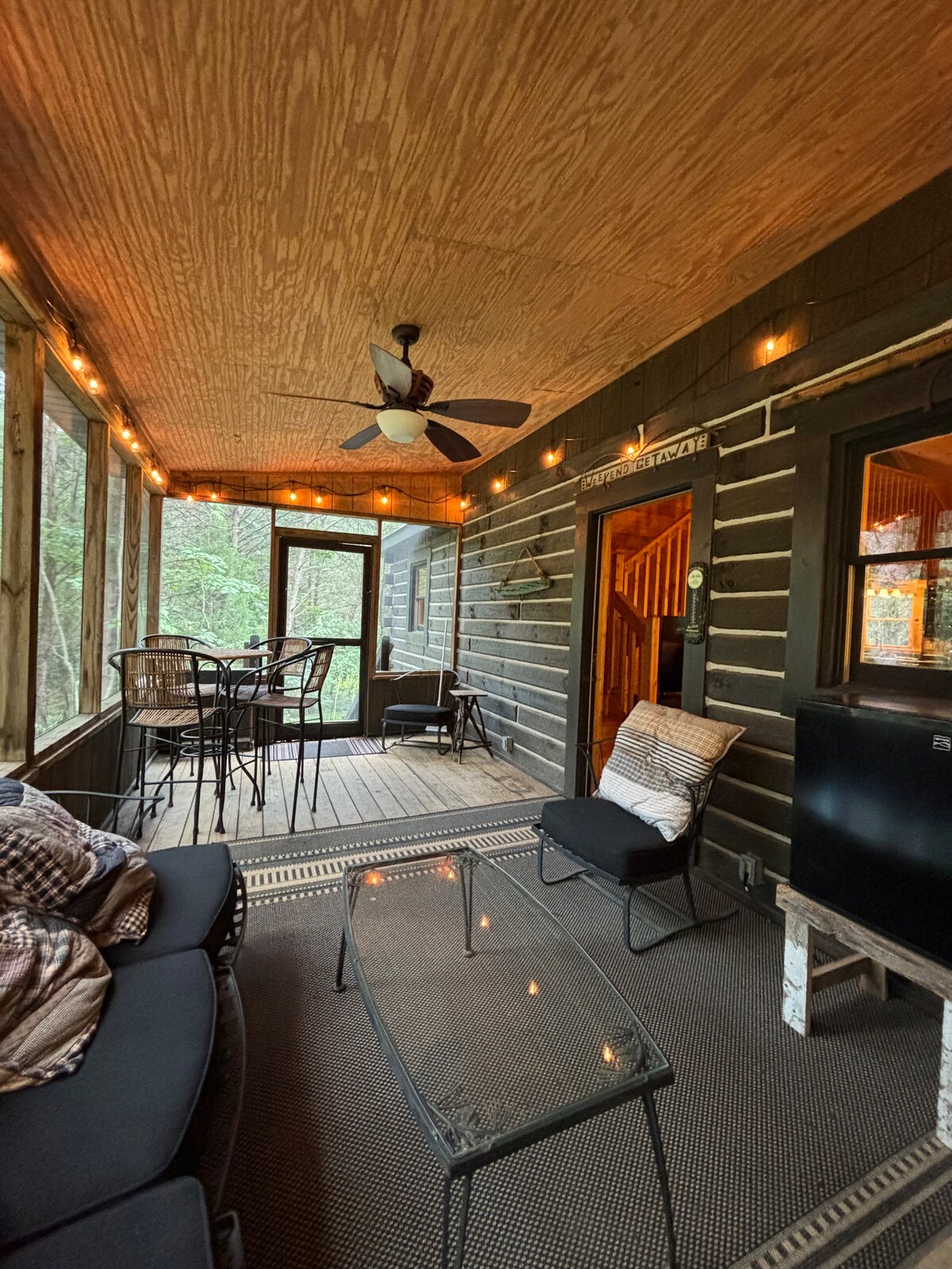 Our log cabin is in the heart of the lush, wooded area of Grant Woods, near the Patoka Lake State Park, Patoka Lake Brewery and Winery. You will stay in a cabin that has recently been renovated and is nestled on a hillside in the woods with a firepit. The cabin overlooks a seasonal stream and sleeps four people comfortably. There is a porch, and a partially covered deck on the back with a propane fire table, convertible daybed couch, reclining chairs and a propane grill.