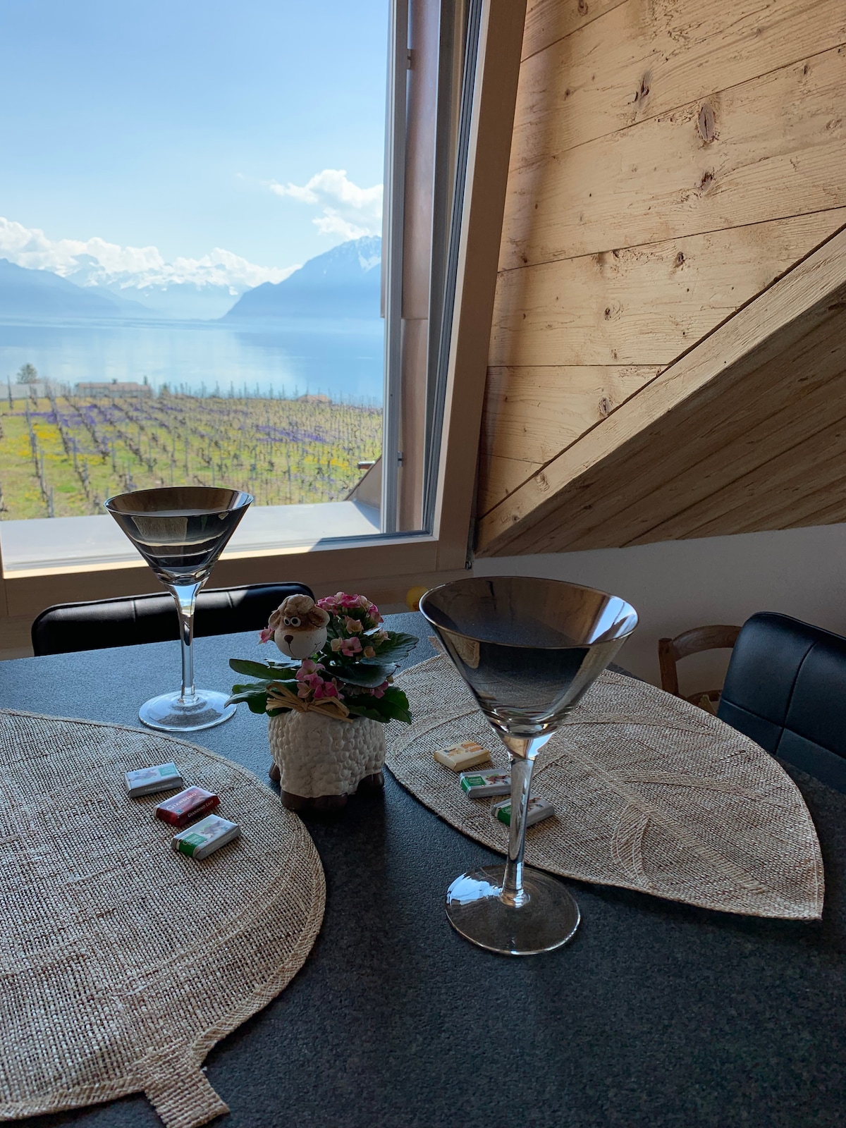 Een bevoorrechte plek met 180 graden uitzicht op de wijngaarden, het meer en de bergen Nieuw appartement, groot terras met uitzicht op het meer, Veel karakter, oud hout, natuurstenen, inloopdouche, haardroger, kitchenette, met gootsteen, koelkast, waterkoker, thee, koffie, magnetron, oven, 1 elektrische kookplaat, twee potten , borden etc. Kluisje, led-tv etc... Minibar, wijnen uit de regio! Gratis openbaar vervoer (trein) van Lausanne naar Montreux! Privé en gratis park voor het huis!