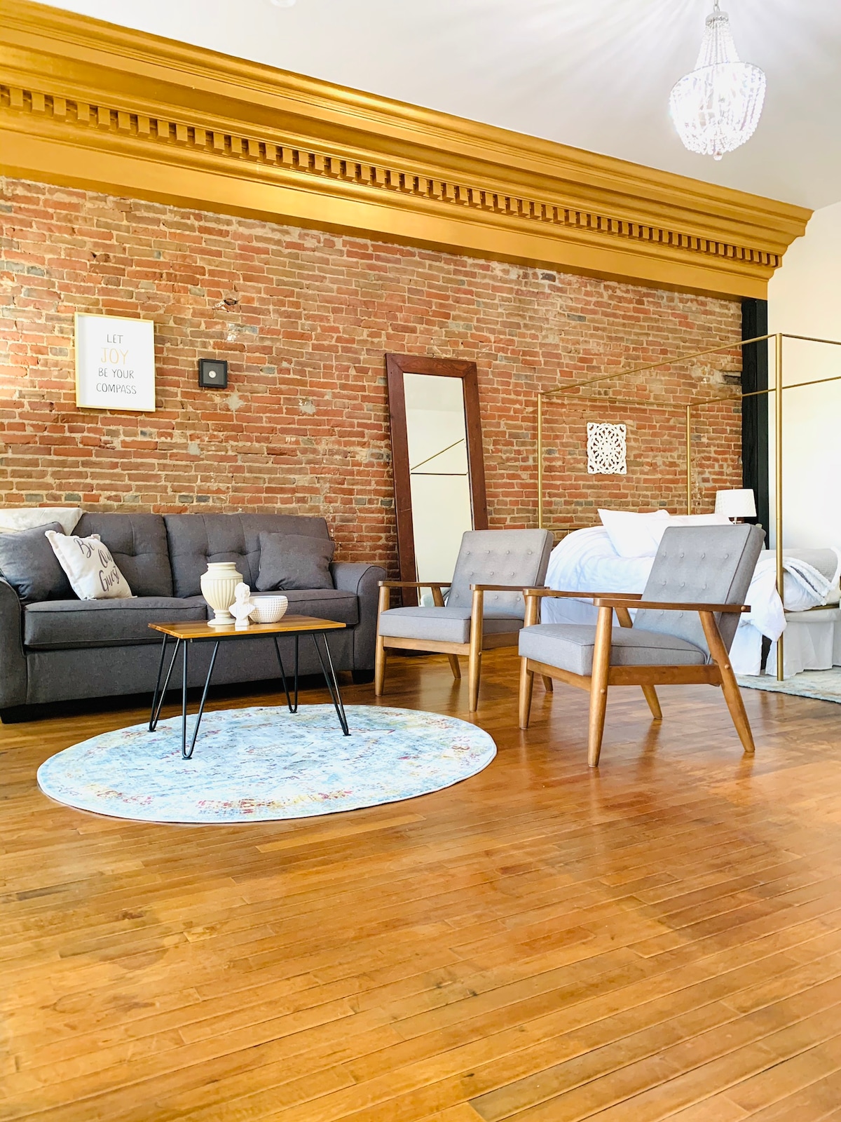 De South Bank Loft beschikt over een grote, open woonruimte in studiostijl, geaccentueerd door prachtige kamerhoge ramen met uitzicht op de historische hoofdstraat in Havana, Illinois. De ruimte is zorgvuldig gerestaureerd en beschikt over hoge plafonds van 12 voet, originele gerestaureerde kroonlijsten, zichtbare bakstenen en originele hardhouten esdoornvloeren. De loft beschikt ook over een kitchenette met high-end kasten, aangepaste tegel rug spatten en onder de kast verlichting.