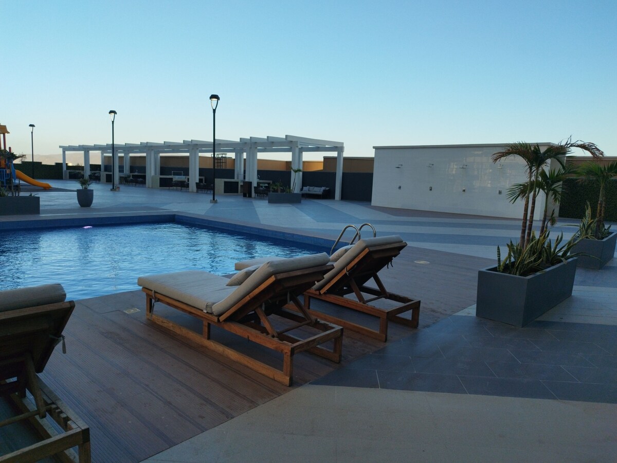 Nieuw appartement op de begane grond voor het zwembad op een geweldige locatie, in de buurt van Aeropuerto, Hospital Ángeles, Plaza Ceiba en Costco: - Twee slaapkamers: hoofd met queensize bed, tweede met tweepersoonsbed - Uitgeruste keuken - tv 4K 55" - Volledige badkamer - Zwembad, buitentafels en coworkruimte - Bijkeuken met wasmachine en droger Geniet van een comfortabel en handig verblijf. We wachten op je!