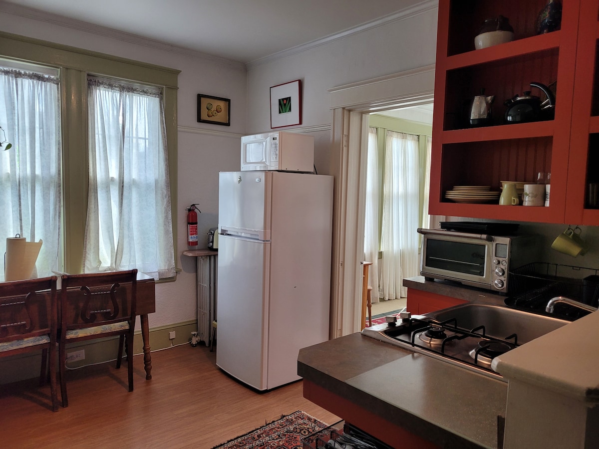 Een loft bedruimte met extra optionele uitschuifbare bank met ergonomische schuimmatrassen. Deze ruimte heeft airconditioning en warmte en verbazingwekkend natuurlijk licht. Gloednieuwe badkamer met regendouchekop! Een complete keuken met minikoelkast, aparte vriesruimte, oven, fornuis en koffie/thee benodigdheden. Centraal gelegen in Brunswick, en rustig! Recht tegenover Bowdoin's Whittier Field en op tien minuten lopen van Maine Street.