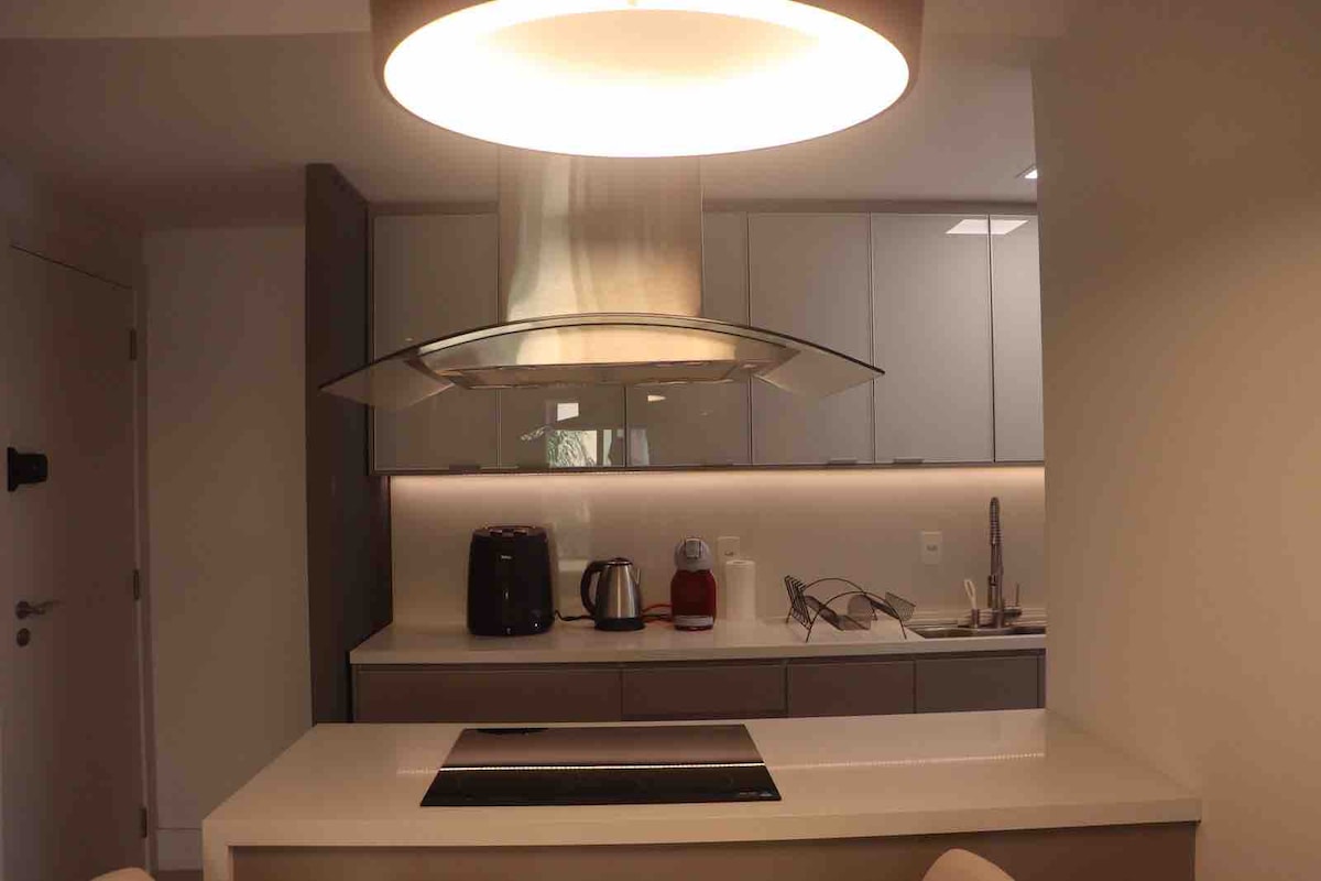 Moderne studio, gloednieuw, gezellig, perfecte locatie, met een prachtig uitzicht vanuit het balkon, vooral 's nachts . Snelle wifi, bureau, 55inch smart-tv, queensize bed. Airconditioning (warm/koud). Wasmachine en droger en een prachtig eiland in de keuken. 50m2 van zeer 27e stijl, rustig. In het Centrum/Batel, dicht bij winkels, banken, winkelcentra, gastronomisch knooppunt en ziekenhuis . In het gebouw :zwembad, fitnessruimte, speelkamer, sauna, jacuzzi, 24-uurs conciërge.