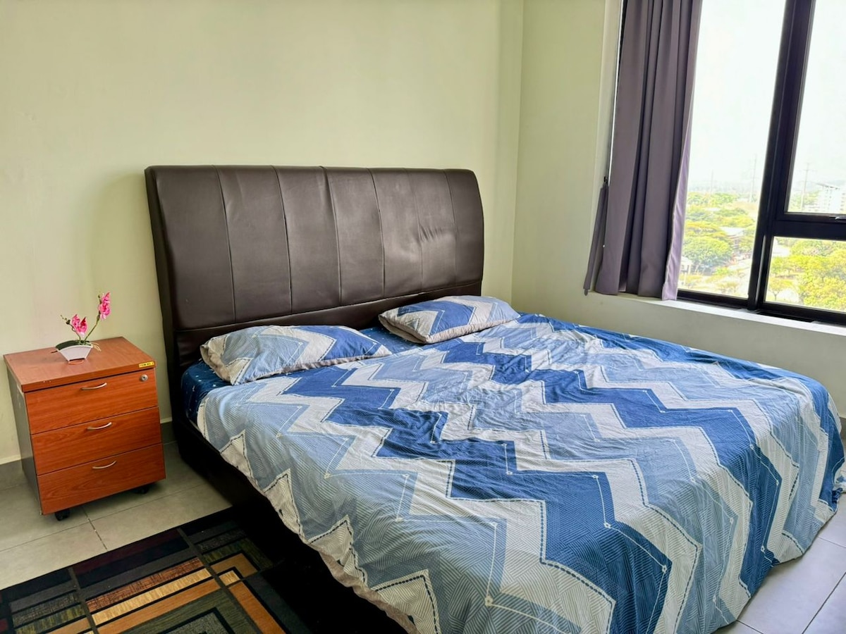 Explore our cozy studio, which can accommodate 2 to 3 people with a queen bed and a sofa bed. Only a 15-minute drive from KLIA T1/T2, the place is surrounded by many restaurants, fast food branches, groceries, and laundry shops, all within walking distance. Savor all the amenities, including the kids’ playground, BBQ area, gym, and swimming pool, with 24/7 security. * Unavailable drop your luggage before check in hours.Due to building designed, need to walk 10 steps staircase to get elevator.