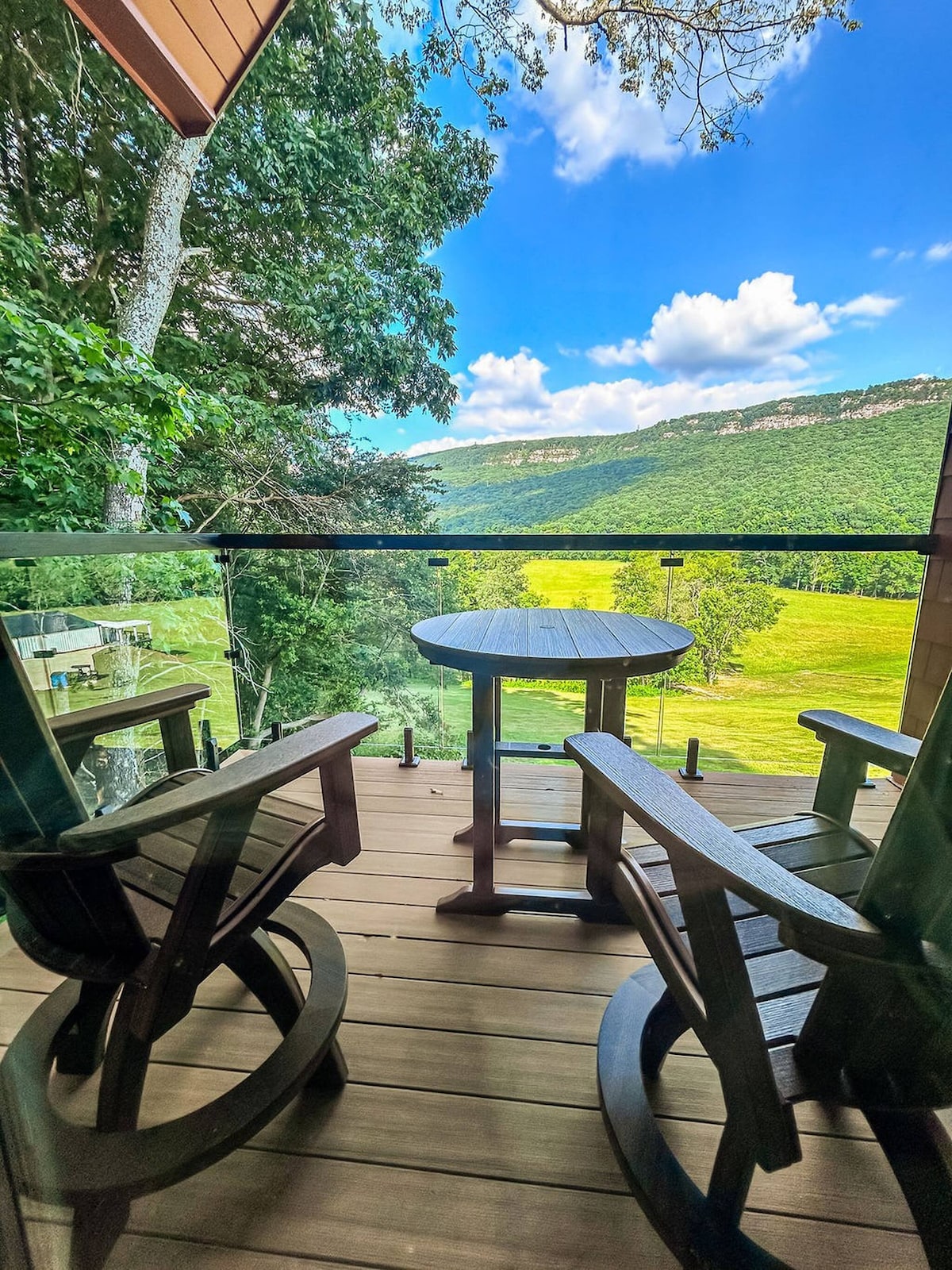 This tiny home is on the historic home site of Fannie Mennen and the Plum Nelly Clothesline Art Show. She even named the road. The home is brand new, artfully decorated and has 1 double bed, 1 bath, a sleeping loft with 2 twin beds, and a queen sleeper sofa. The view is from 2000 ft elevation and looks into the valley and across to the mountain again. There is civil war history on the property. There is a 100 ft drop so guests are asked to not stay here with young children.