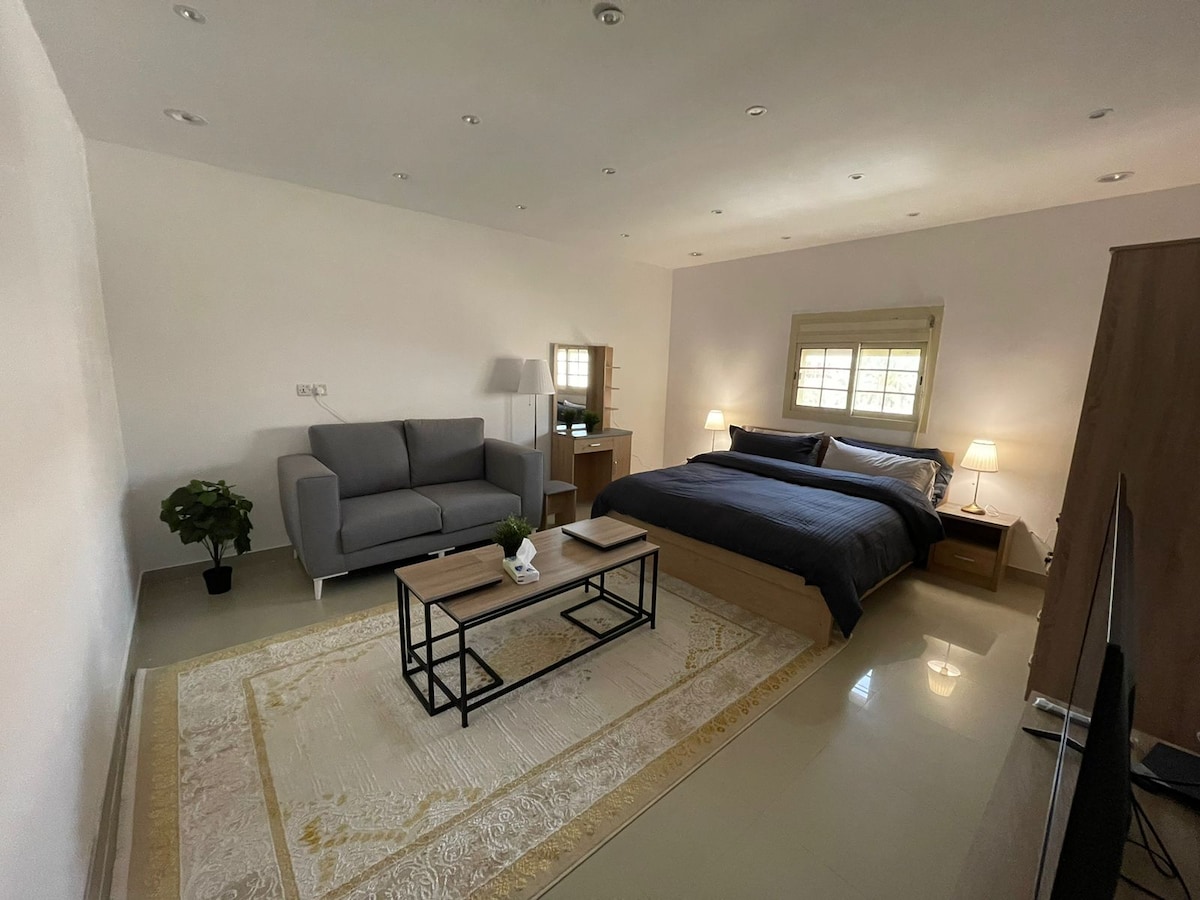 *Welkom in je huis, omgeven door tuinen en wandelpaden. * Intelligente toegankelijkheid. * Luxe oftalmisch hotelmeubilair met alles erop en eraan. * Aparte slaapkamer met specificaties voor jou: 1-A ruime grote badkamer met een regendouche voor ontspanning . 2- Eigen kleedkamer met ruime lades om aan te kleden 3- Een privé en elegante 55-inch Smart Screen-sessie om te kijken wat je leuk vindt terwijl je ontspant op het bed van King's hotel. *Een zeer ruime lounge met een 65-inch slim scherm, koffiehoek en een ontspannende hoek. *Keuken met kookbenodigdheden van oven, koelkast, wasmachine en speciale hoek om te strijken.