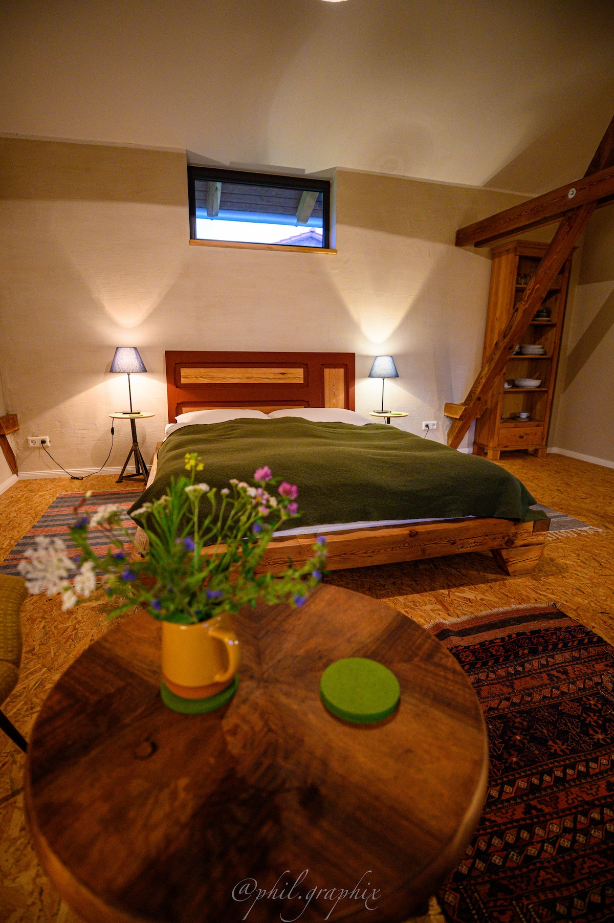In unserer mit Liebe sanierten und eingerichteten Gästesuite am Waldrand kommst Du zur Ruhe. Hier ist der richtige Ort zum Lesen, Schreiben, Meditieren, Kochen, zum Sternegucken, Pilzesammeln (Dörrautomat vorhanden) Hühnerfüttern, für Lagerfeuer, Waldspaziergänge und Tierbeobachtungen. Wer eine Zeit lang abschalten und die Natur genießen möchte, ist hier richtig. Der Ort eignet sich auch gut für etwas längere Auszeiten, etwa um ein Buch zu schreiben.