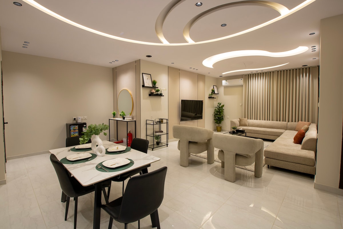 Ontspan in deze rustige en elegante woning. Luxe suite met volledig panoramisch uitzicht op de tuin met bessen, rozen, rozen en druiven, slimme toegangsservice en een groot modern scherm met 4K UHD-technologie met een abonnement op iptv alle kanalen van de wereld, evenals Bein Sports, Saudi Sports, showtime, Netflix en alle films en series, (( En het wereldkampioenschap😍)) Er is een moskee in de buurt van de woning.. Het ligt dicht bij Al-Radf Park, restaurants, markten en luxe cafés. Er is een gids om gasten te voorzien van alle plaatsen die een bezoek waard zijn.