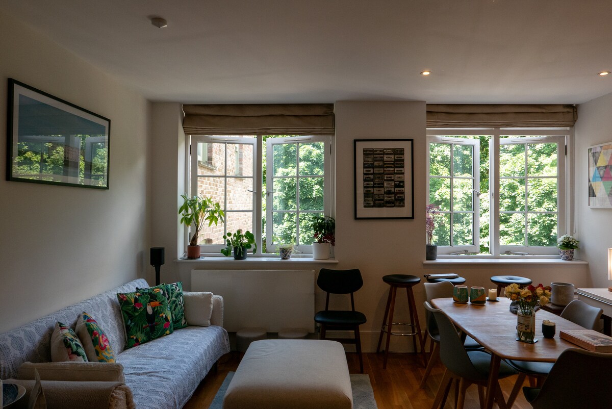 Een maisonnette van twee verdiepingen op de begane grond met een prachtige boom- en struikvormige tuin. De ruimte heeft een karakter uit het midden van de vorige eeuw en we hebben het zorgvuldig gerenoveerd om zowel gezellig als functioneel te zijn, geïnspireerd op zowel het Britse modernisme als het Scandinavische design. Beneden vind je een volledig uitgeruste keuken en een zachte woonkamer met uitzicht op de tuin. Boven een ontspannende hoofdslaapkamer met een super kingsize bed en een warme afwerking. De tweede slaapkamer heeft een comfortabel kingsize bed. (Britse maten)