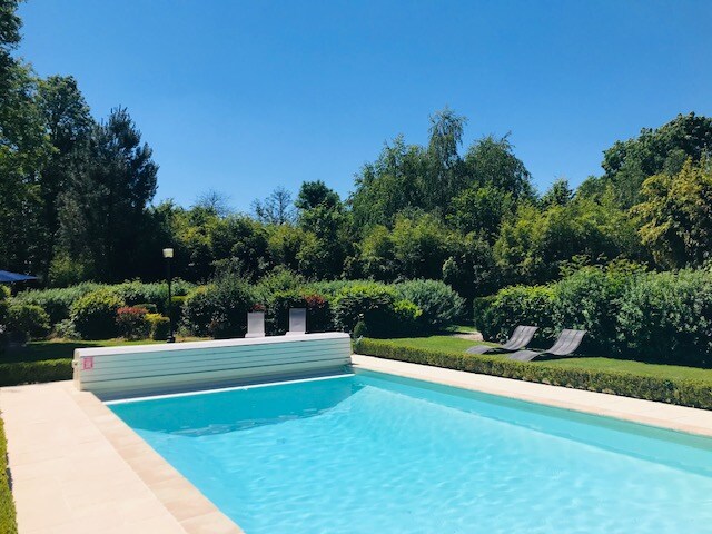 Licht, ruim, comfortabel landhuis met alle gemakken van modern wonen, waaronder een open woonkamer van 80 m² met open haard, 8 slaapkamers, overdekte jacuzzi en een overdekt houten zonneterras. Meer dan 4 hectare aan tuinen, weidevogels, boomgaard en rivier. Geweldig voor vrienden of familiefeestjes. - Strikt beperkt tot maximaal 15 gasten (baby 's inbegrepen)