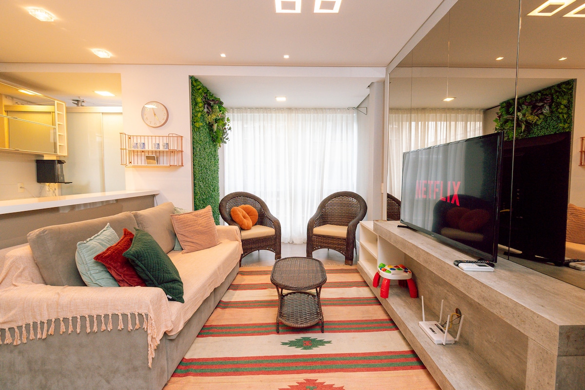 In Jurerê - het beroemdste strand in Florianópolis, rustige zee, prachtige landschappen en restaurants. Je hebt de privacy van een modern appartement met de voorzieningen van een vijfsterrenhotel, inclusief dagelijkse schoonmaak. Perfect voor koppels, solo-avonturen, zakelijke reizigers en gezinnen (met maximaal twee kinderen, van wie er één is ondergebracht in een wiegje). Alleen optionele hotelservices: restaurant, ontbijt of parkeerservice worden rechtstreeks aan het hotel betaald.