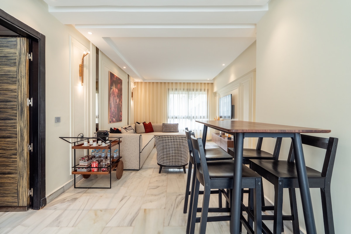 Het jachtappartement is gelegen aan de Boulevard de la Corniche in een prestigieuze residentie tegenover de oceaan, de nieuwe boulevard van Casablanca en een paar meter van de meest prestigieuze restaurants en bars van de stad. Het appartement heeft geen uitzicht op de oceaan, maar op de tuin van het gebouw, maar bij de uitgang van het gebouw vind je een adembenemend uitzicht op de Hassan 2-moskee en de corniche .