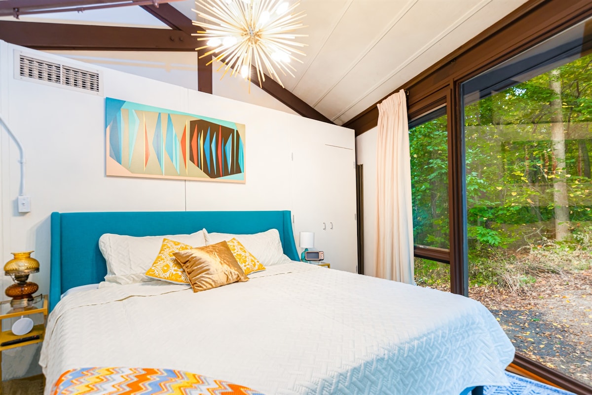 Unique "tree house" - an octagon tiny house, surrounded by the woods! 2 bedroom, 2 bathroom home you can enjoy the views of nature all around, with floor to ceiling windows. One king bed, one queen bed. Modern comforts with fun flash blacks. Private hot tub and firepit look into serene woods! Sit by the indoor gas fireplace and enjoy our record collection. Soak in a Japanese soaking tub. Enjoy fall colors or watch snow fall! Community indoor poor, seasonal outdoor pool, gym access