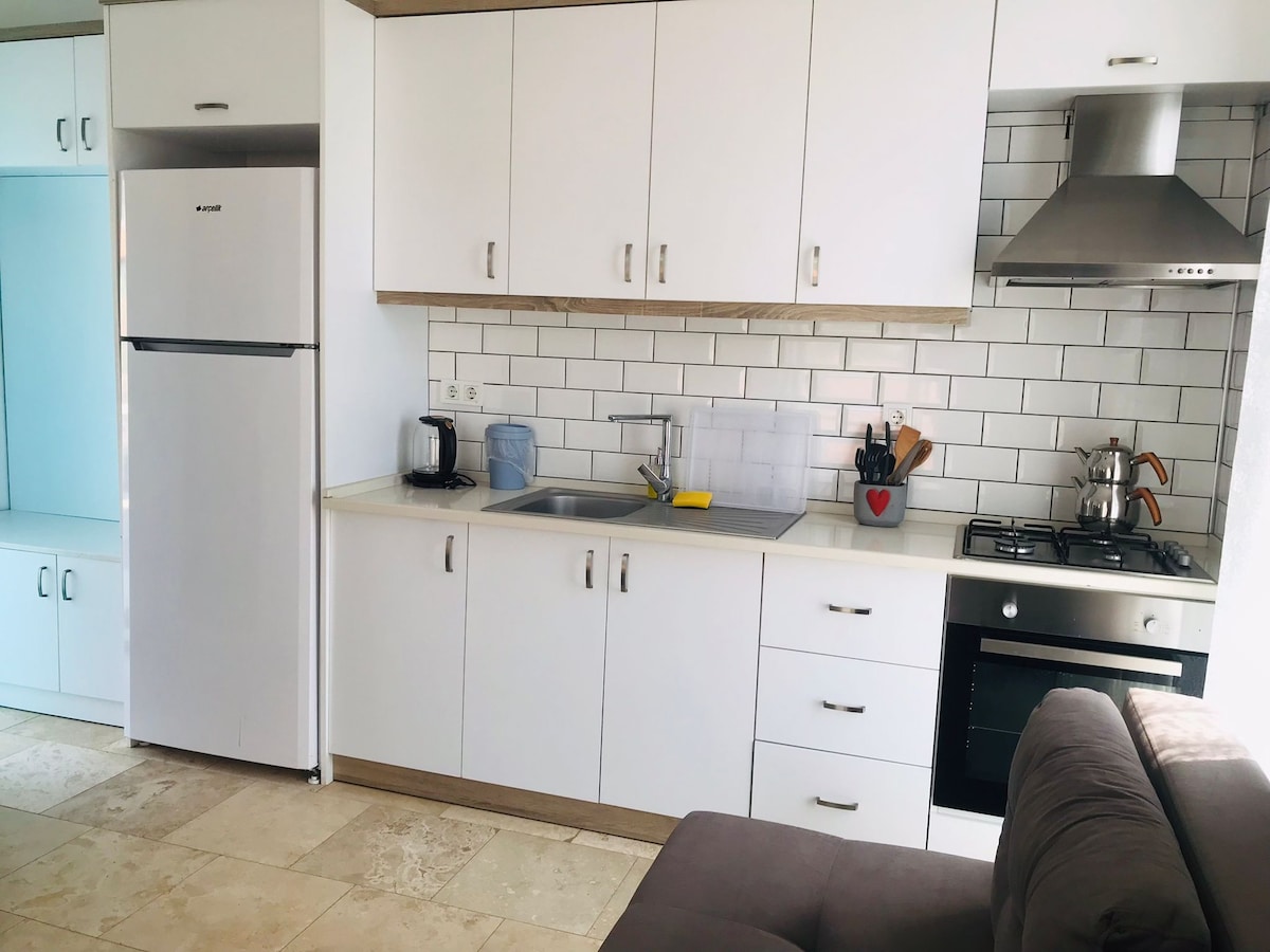 Als je wilt in deze rustige accommodatie, kun je ontspannen met onze huwelijksreis koppels en gezinnen. Welkom in ons 1+1 appartement met een complete keuken, tv , airconditioning en stenen BBQ in onze tuin om aan al uw behoeften te voldoen. Onze uiterst comfortabele kamer met een kingsize Tsjechisch jacht, dat geschikt is voor een tweepersoonsbed en 2 volwassenen, ligt op 3 4 minuten loopafstand van de zee, wacht op je voor een dromerige vakantie met zijn prachtige natuur en uitzicht.