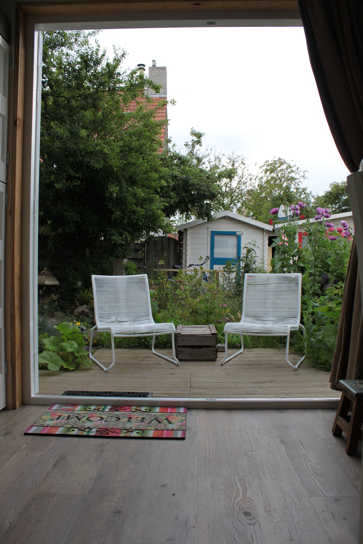 Ontspan en kom tot rust in deze vredige, mid-century geïnspireerde vakantie studio. Een heerlijk vakantieverblijf met ruime woonkamer, eigen (aparte) badkamer, slaapvide (let op: smalle stijle trap) en eigen buitenterras met zitje en parasol. De studio is heerlijk licht door de vele ramen. In de studio is een ruim keukenblad aanwezig met verschillende keukenfaciliteiten. Let wel op: door de smalle en stijle trap naar de slaapvide niet geschikt voor ouderen of minder valide.