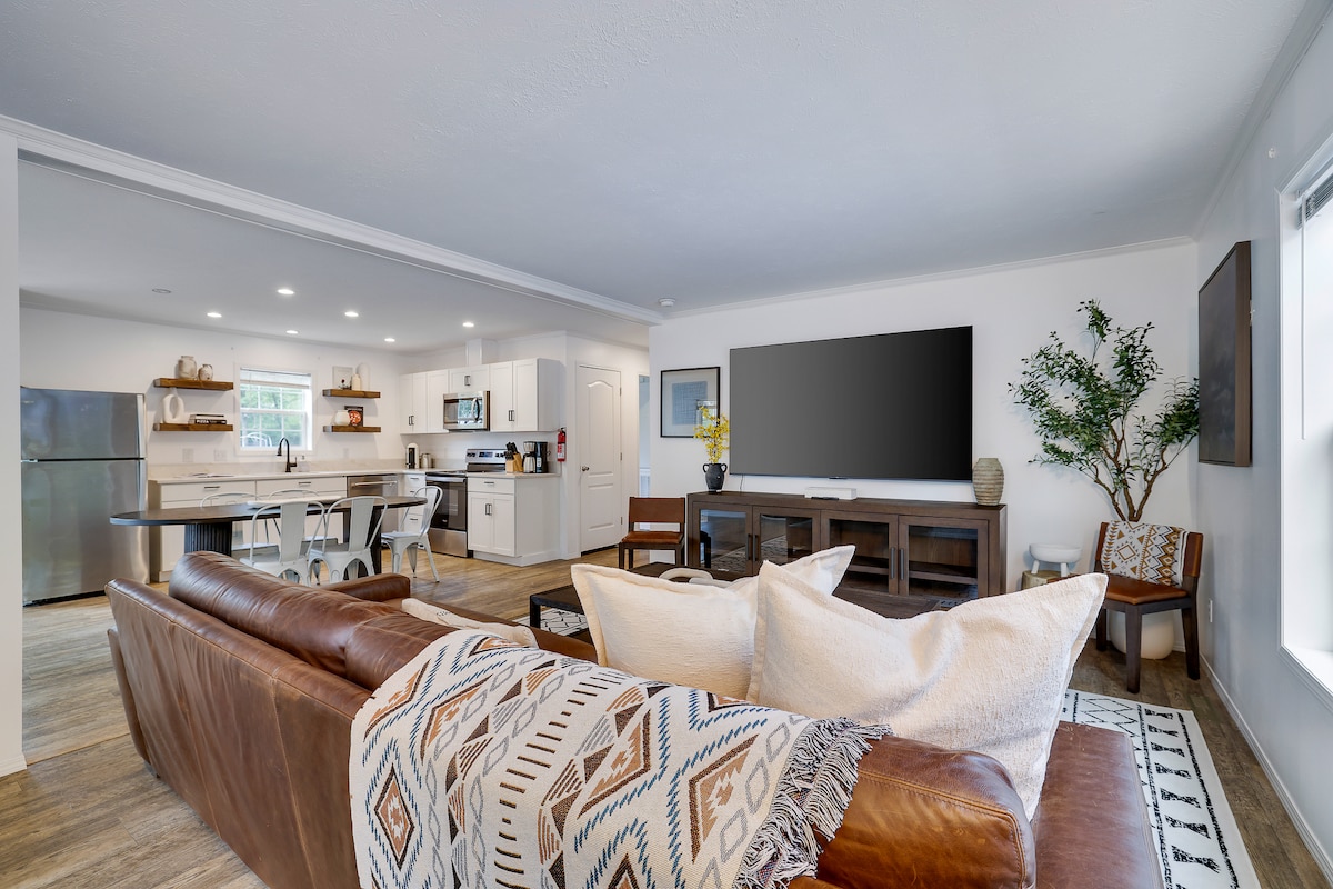 Adem uit en laad op in deze luxe ruimte aan de voet van de Shawangunk Mountains. Dit juweeltje beschikt over een open keuken en woonkamer, perfect om verbinding te maken met de natuur. Geniet van de high-end Foster Leather Sofa, gezellige filmavonden op een 120-inch projectiescherm en een houtkachel voor koude avonden. Elk detail, van schoon beddengoed tot een betekenisvolle bibliotheek, is met zorg samengesteld. Ontdek verborgen berichten in het hele huis en nodig je uit om te verkennen en tot rust te komen in dit serene toevluchtsoord.