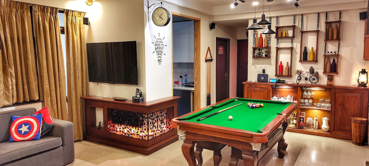 Een plek die zich staande houdt te midden van de drukte. Ideale plek voor muzikanten onderweg, reizigers met een panache voor stijl of gewoon iemand die op zoek is naar een betaalbaar en toch uniek kort verblijf in de stad. De 3 BHK heeft een exclusieve studio om te voldoen aan alle behoeften van nieuwkomers, een kantoorruimte, 1 hoofdbed, 1 uitklapbaar bed en een L-vormig slaapbank en een keuken. Alle ruimtes zijn voorzien van airconditioning en slimme verlichting. Woonkamer uitgerust met 55 inch tv, 7,2 AV & 10ft proj. scherm.