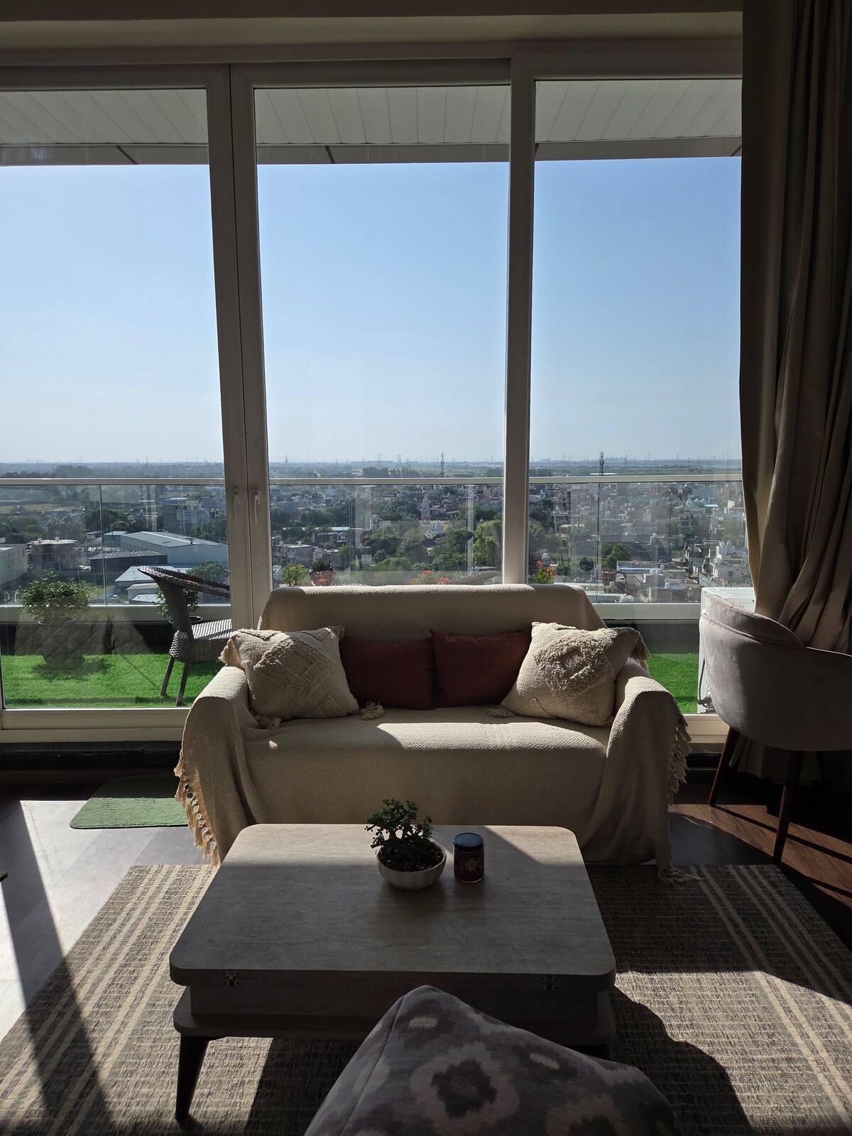 Welkom in onze geweldige suite op de 15e verdieping van een hoog gebouw. Dit 2bhk is volledig fris appartement. Brede privépatio met uitzicht op de skyline van de stad maakt het uniek in de klas. De plek is perfect om te ontspannen en te genieten van een schilderachtig uitzicht op de moderne architectuur. Appartement is geladen met 3 smart-tv 's (alle toepassingen werkt), 2 gezellige tweepersoonsbedden, 2 grote kledingkast met kluisje, 6 persoons bank, stijlvolle salontafel,strijkplank, koelkast,magnetron,inductie,waterkoker, broodrooster en nog veel meer