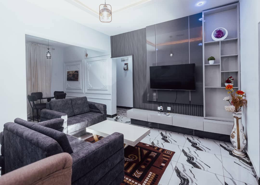 All Day uninterrupted power supply fully serviced round the clock house keeping fitted and functional kitchen smart tv free WiFi free and secure parking armed security guard government reserved area only 2 mins from all amenities including shopping cinema bar and lounges.
