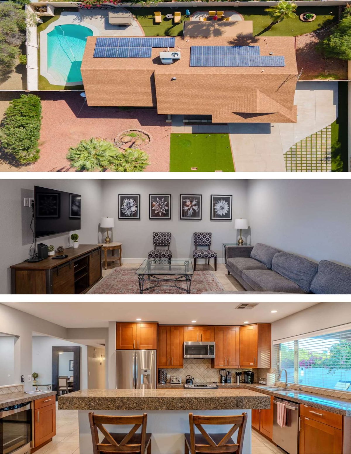 Dive into luxury at this single-family home with a super PRIVATE heated turquoise pool, perfect for a warm midnight swims. (No charge to heat the pool). Pets stay for free! This home features an elegant mix of stone and gold, plus a spacious open-plan layout. Entertain in style with the large updated kitchen. Enjoy a BBQ in the serene outdoor space. Centrally located, it offers easy access to Scottsdale, hiking trails and major freeways. Book now for an exquisite escape!