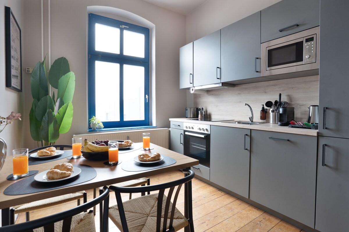 Midden in het centrum, ervaar Dessau vanaf een van de mooiste plekjes boven de daken van de stad! DROMEN 'IN DESSAU CITY': Appartement van ongeveer 75 m² met lichte en vriendelijke inrichting, gelegen op de bovenste verdieping. Beste gasten, hartelijk welkom in Dessau!