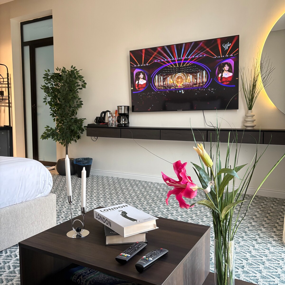 Hotelappartement met één slaapkamer, woonkamer en balkon met een speciale koffiehoek Ontsnap naar dit comfortabele toevluchtsoord met één slaapkamer, ontworpen voor comfort en elegantie. Ideaal voor alleenreizigers of koppels, het combineert modern comfort met een vleugje luxe: Een comfortabele slaapkamer met een queensize bed met zachte, luxe dekbedden. Een lichte woonkamer met een comfortabele bank, een smart-tv en een elegante inrichting. Een eigen balkon, ideaal om 's ochtends koffie te drinken of te genieten van de zonsondergang. Snel internet en een rustige sfeer om te ontspannen of werk te doen.