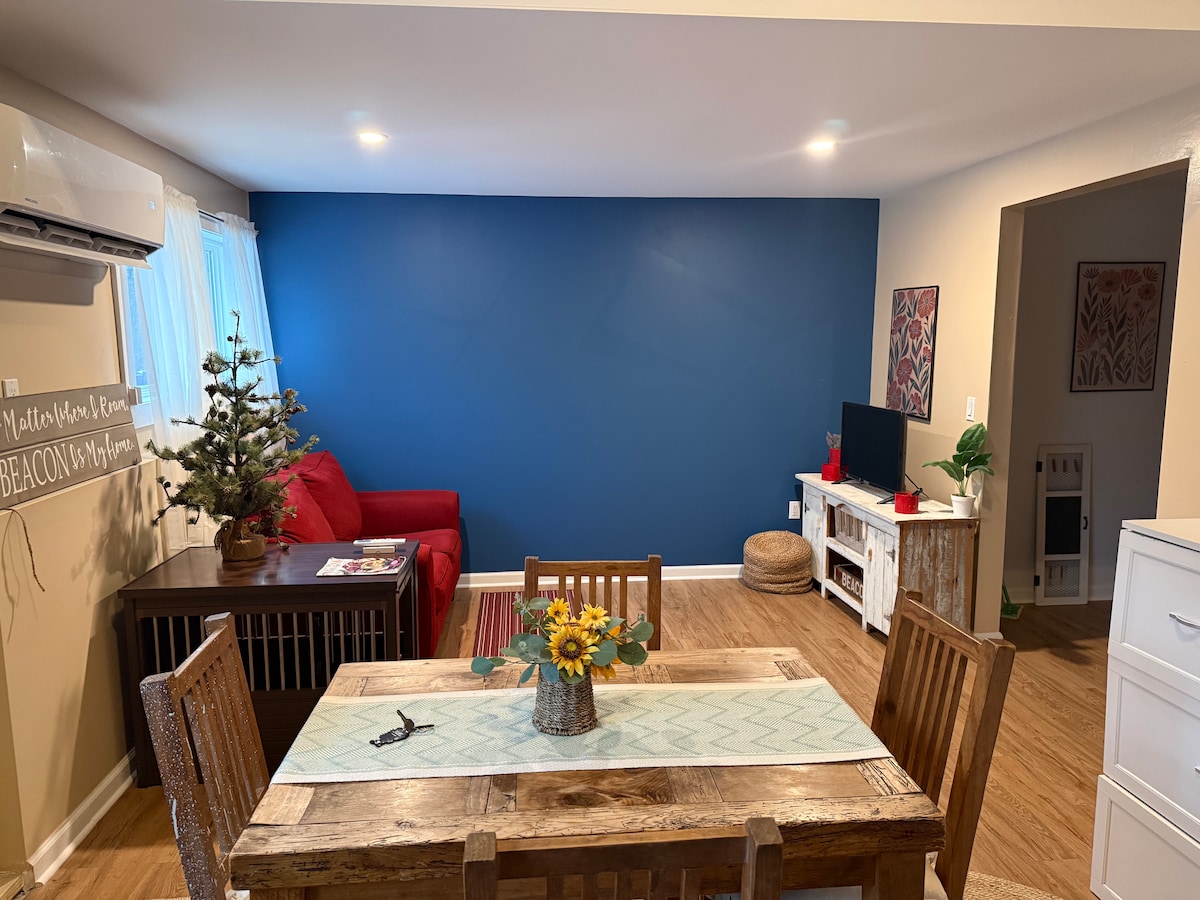 Welkom in je huisdiervriendelijke Beacon-retraite! Dit ruime herenhuis met 3 slaapkamers en 1,5 badkamers ligt op slechts een steenworp afstand van Main Street en biedt je een steenworp afstand van de beste koffiehuizen, restaurants, boetieks en galeries van Beacon. Geniet van een korte wandeling naar het Roundhouse, Hudson Valley Brewery en andere lokale favorieten. Het treinstation en dia:Beacon museum liggen op slechts 6 minuten rijden en de Loop Bushalte ligt op slechts twee blokken afstand voor gemakkelijk lokaal vervoer.