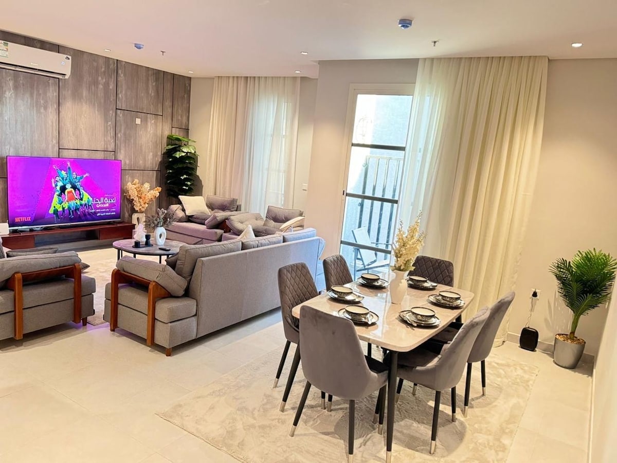 شقة بتصميم أنيق وعصري جديدة تقع بالقرب من الأماكن الترفيهية (البوليفارد) والمطاعم والكافيهات واسعة ومجهزة بالكامل دخول ذكي للخصوصية مع باركنج للسيارة وركن للقهوة والشاي مع آلة صنع القهوة وطاولة كي ومكواة ومطبخ جاهز للطهي مع ميكرويف وثلاجة ويوجد شرفة خارجية تحتوي على شواية كما نحرص ونهتم بالنظافة وفرنا أدوات إستخدام شخصية (فوط وسليبر وصابون وشامبو وكريم وفرشاة اسنان ومناديل ) ويوجد ادوات السلامة اللازمة للمسكن كما انها عازله للصوت لتوفير الهدوء للنزلاء مع وجود شاشة تلفزيون ذكية وإنترنت قوي