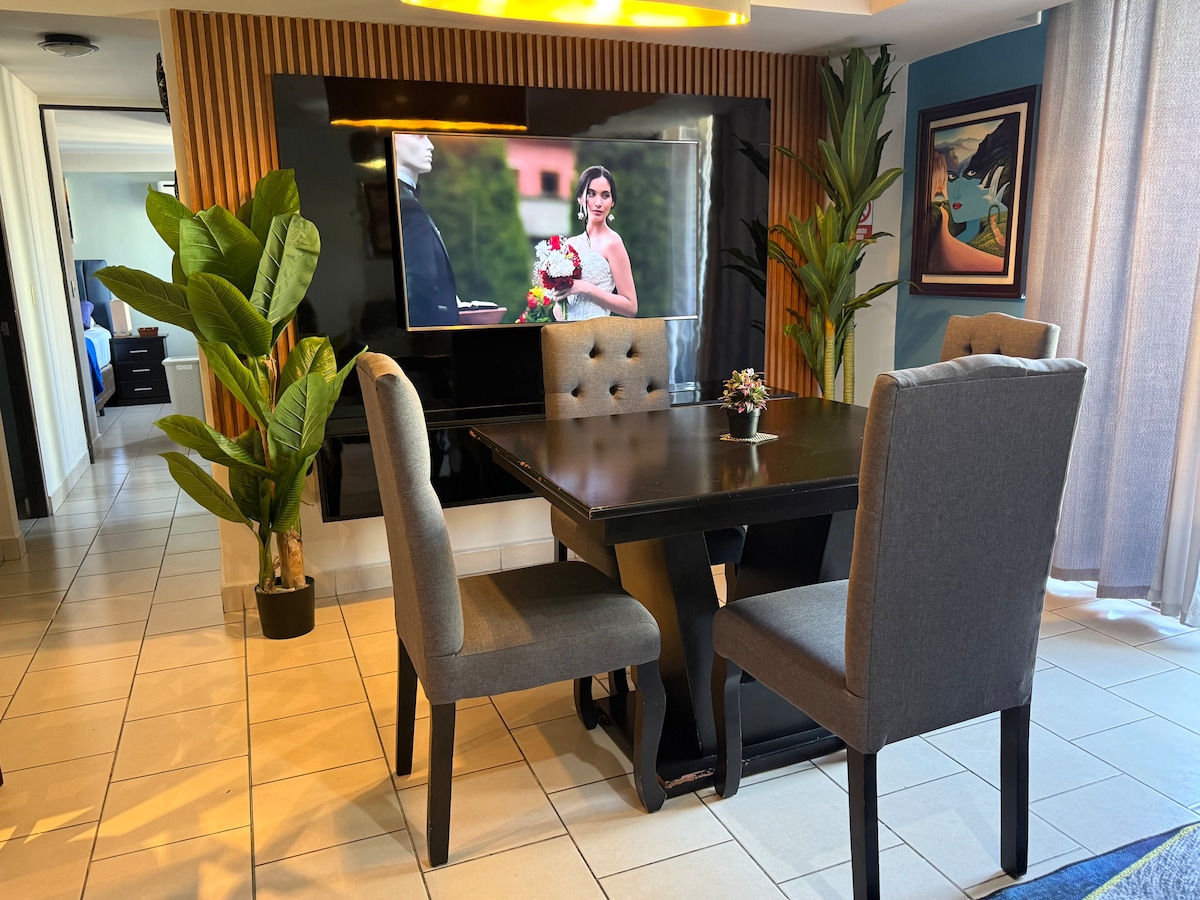 Geniet van een stijlvolle ervaring in deze luxe accommodatie in een gebied van de meest exclusieve, rustige en centrale in Tegucigalpa. Bijzonder om in een gezins- en werkomgeving door te brengen. Het heeft de diensten: - Wifi 100MB rood 5g - Bediening via spraak (Alexa) - Netflix, Max en Prime - Toegang zonder door de lobby te gaan, sleutelslot - Strenge 24-uursbeveiliging -50inch tv in Sala, 43 "in de grote kamer en 34" in 2 slaapkamers. - Kookgelegenheid gevuld en klaar om te koken -Centro de Lavado