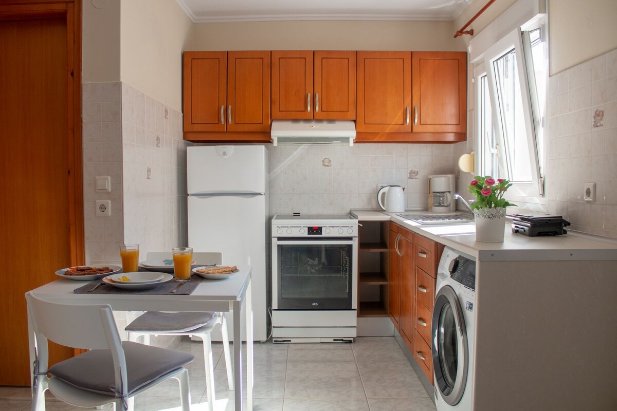 De comfortabele studio is 25 m² en beschikt over 2 eenpersoonsbedden die kunnen worden samengevoegd tot een tweepersoonsbed en een slaapbank en een kitchenette. Het is uitgerust met alles wat je nodig hebt voor een ontspannen en veilige vakantie. De studio is voor privégebruik (niet gedeeld met andere gasten). Het strand van Kamari en de bushalte liggen op slechts 2 minuten afstand. Een van de belangrijkste voordelen is de locatie, die gemakkelijke toegang biedt tot winkels, restaurants en een 24-uursmarkt. Het is goed verbonden met de bus naar Fira stad en de rest van het eiland