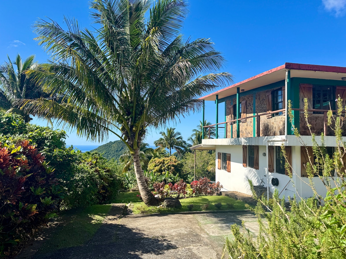 Unique ! Exceptionnelle propriété de charme, SPA, 600 m alt, vue sublime mer et volcans. Décoration raffinée, cosy et trendy, avec antiquités, tableaux et objets d’art . Grande réception de 110 m2. Chaîne HI-FI professionnelle. TV connectée grand écran. Fibre optique. 3 salons extérieurs 200 m2 sous varangue. Jardin clos tropical paysagé de 2500 m2. Équipements neufs de qualité et cuisine super équipée. Elegant estate calme et ventilé. Départ des treks vers chutes, 10 km de Roseau et des plages