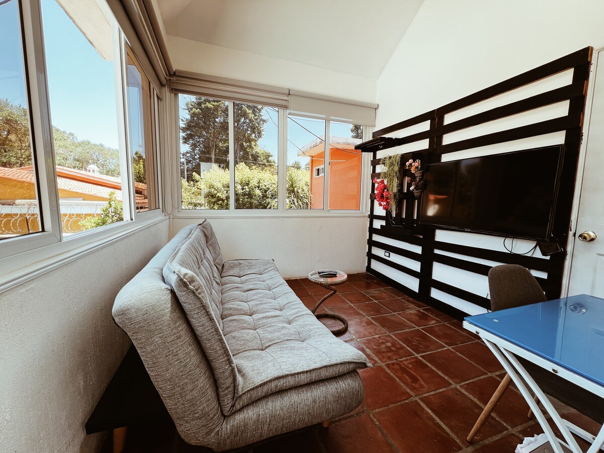 Imagine being surrounded by natural light in an elegant studio designed to reconnect with yourself. Located in the heart of Muxbal, this space offers seremity without disconnecting from the city. Perfect for travelers looking for more than just a place to sleep: here you'll find style, peace, and functionality. We feature panoramic walls with views of Guatemala City, the forests of Muxbal, and the iconic Agua, Fuego, Acatenango, and Pacaya volcanoes.