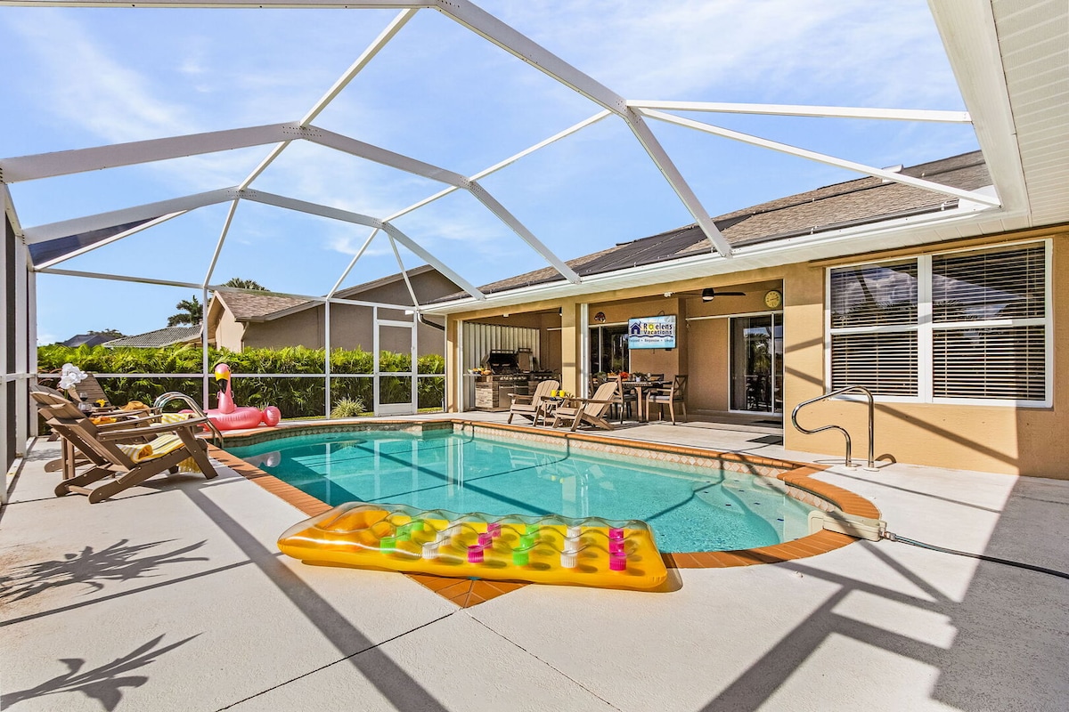 🌴 Tropische oase met verwarmd zoutwaterzwembad – perfect voor gezinnen! 🏡 Kleine hond vriendelijk 🐕 (huisdiertoeslag: $ 150 voor de eerste week, daarna $ 50 per extra week). Deze ruime 4BR, 3BA-woning biedt plaats aan 12 gasten! Tot de voorzieningen behoren een kingsize mastersuite, twee queensize kamers en een kamer met stapelbed (6 slaapplaatsen). Geniet van een verwarmd zoutwaterzwembad, buiten dineren en barbecueplaats. Ontspan binnen met een grote tv, spelletjes. Dicht bij stranden, winkels en bezienswaardigheden! Boek nu voor het ultieme uitje! ☀️🏖